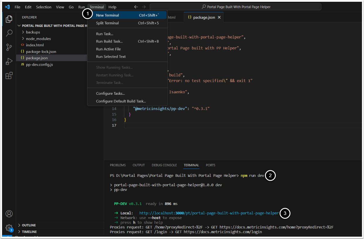 Run npm i @metricinsights/pp-dev to install the Portal Page Developer package.