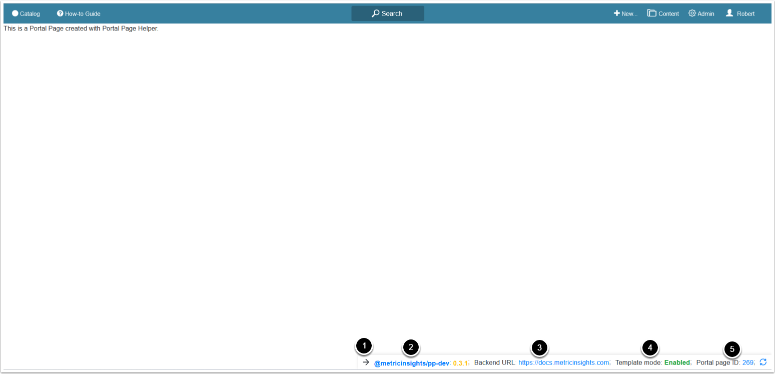 Once the Portal Page is opened, the Portal Page Developer Helper tool panel is displayed at the bottom-left corner of the screen with its controls: