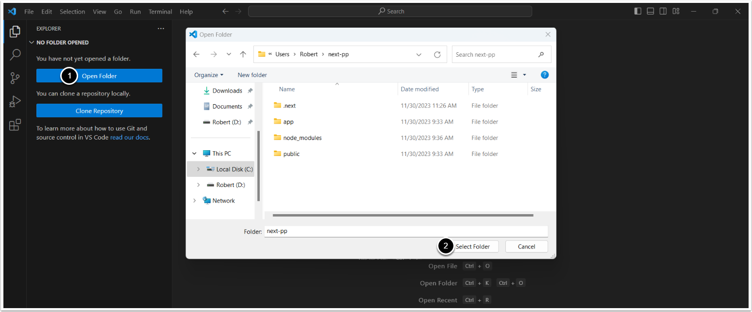 - Ctrl + K Ctrl + O or [Open Folder]