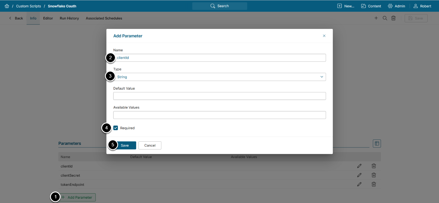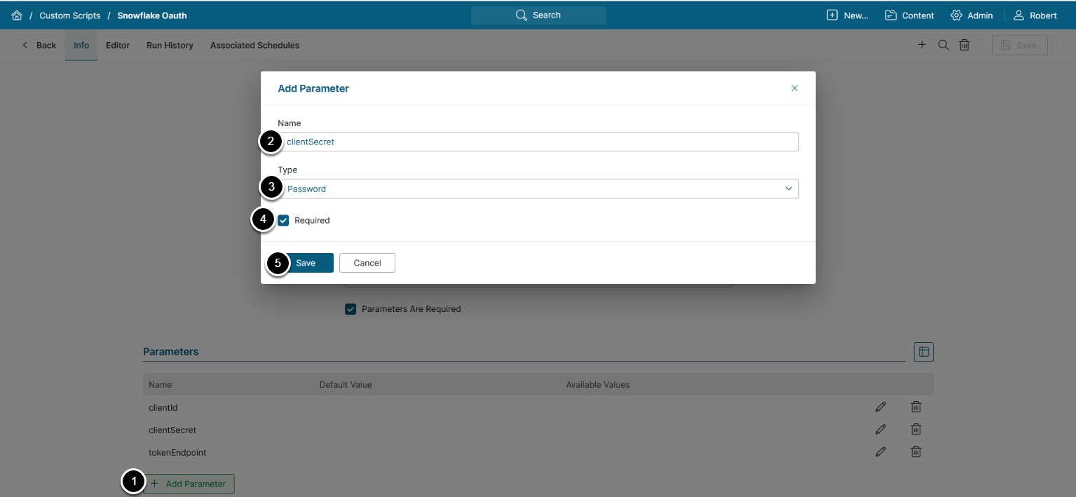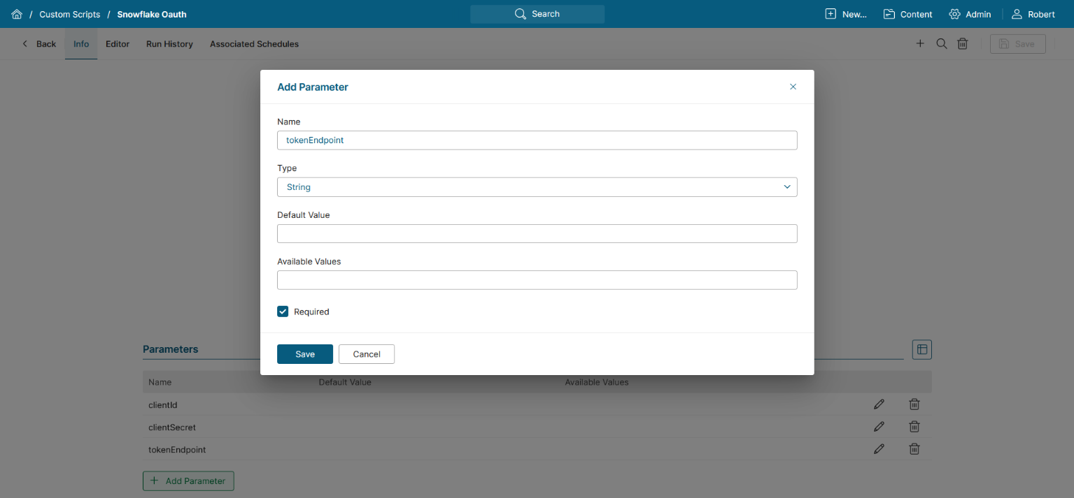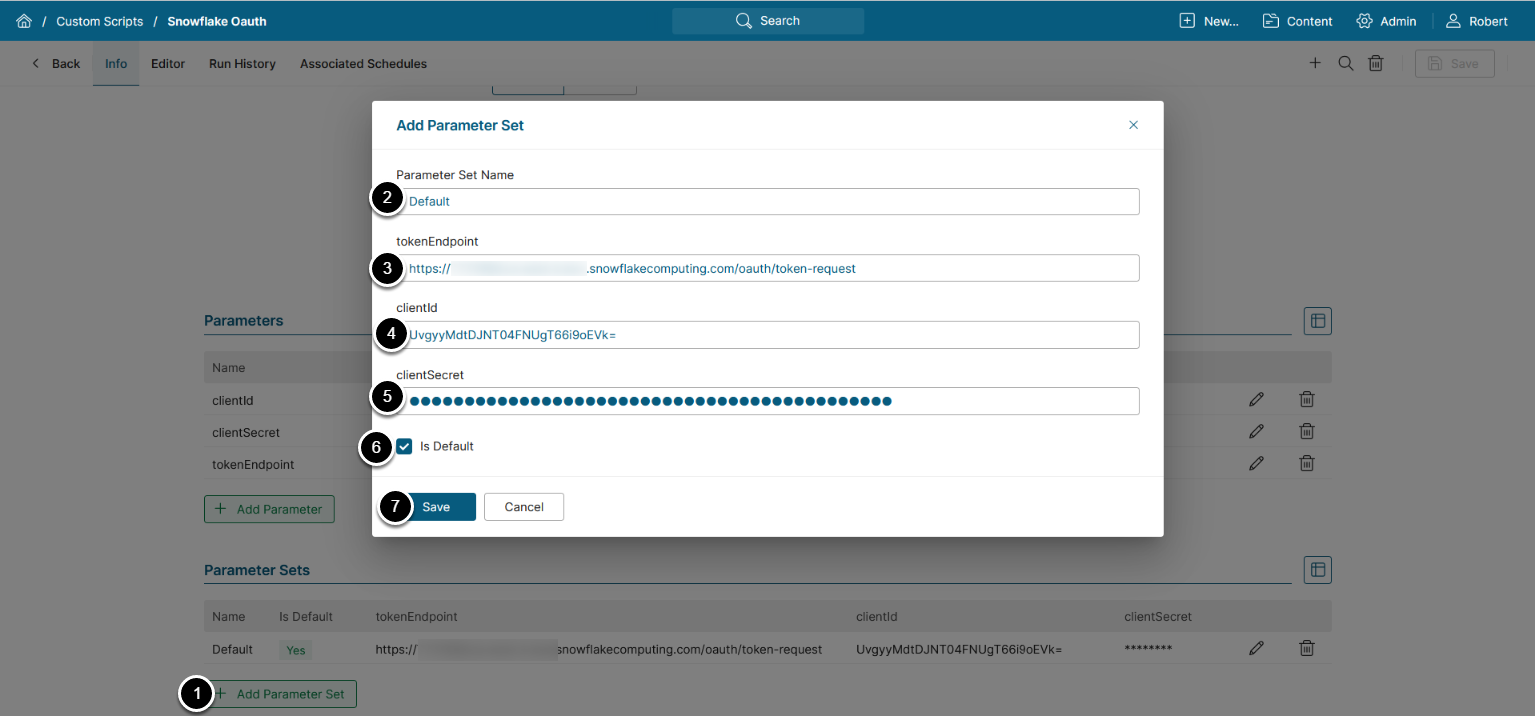 - The Custom Script sends a request to the Snowflake token endpoint using the Client ID and Client Secret. These credentials are securely stored as Custom Script Parameters, with the Client Secret encrypted.