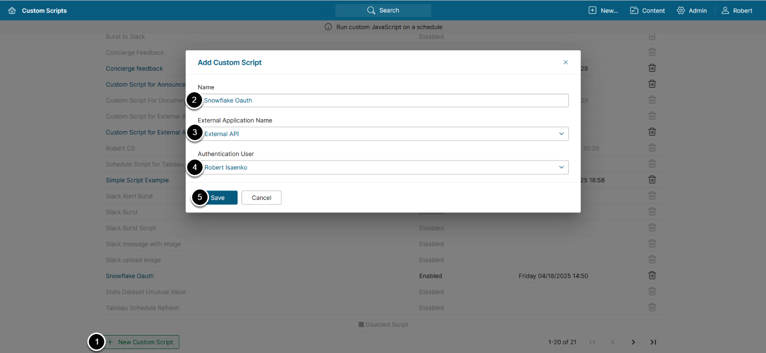 - Authentication User: Choose a User on whose behalf the Custom Script will operate.