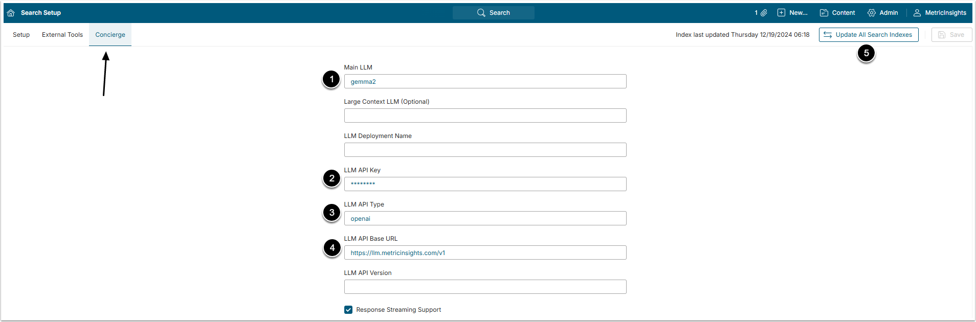 While Concierge service works best on large LLM Models, such as GPT, it might be more convenient to use a local LLM Model. Unlike a large LLM Model, a local one does not require access through the firewall and thus demands fewer security considerations. Metric Insights allows for the connection of Concierge to a local LLM model, such as Google Gemma. This article describes how to establish a connection between Concierge and the Google Gemma LLM Model.