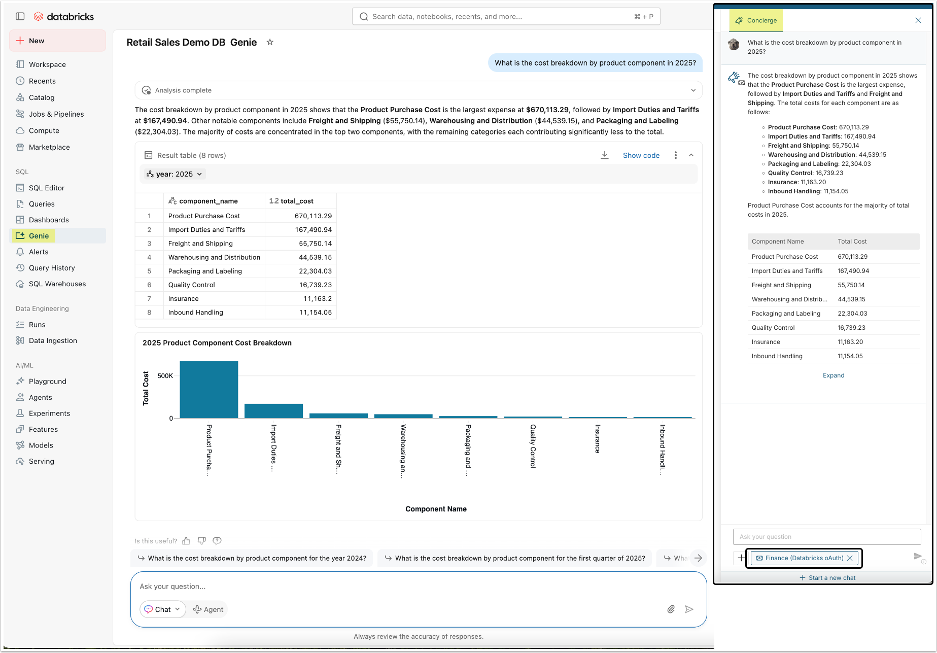 In this example, the same query was sent to Databricks Genie and Concierge Domain that is connected to Databricks External Resource.