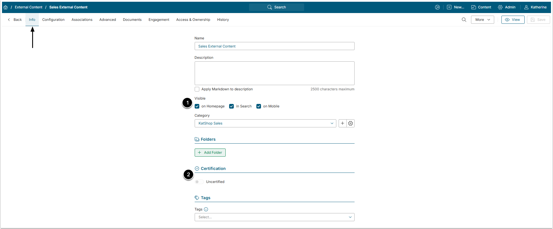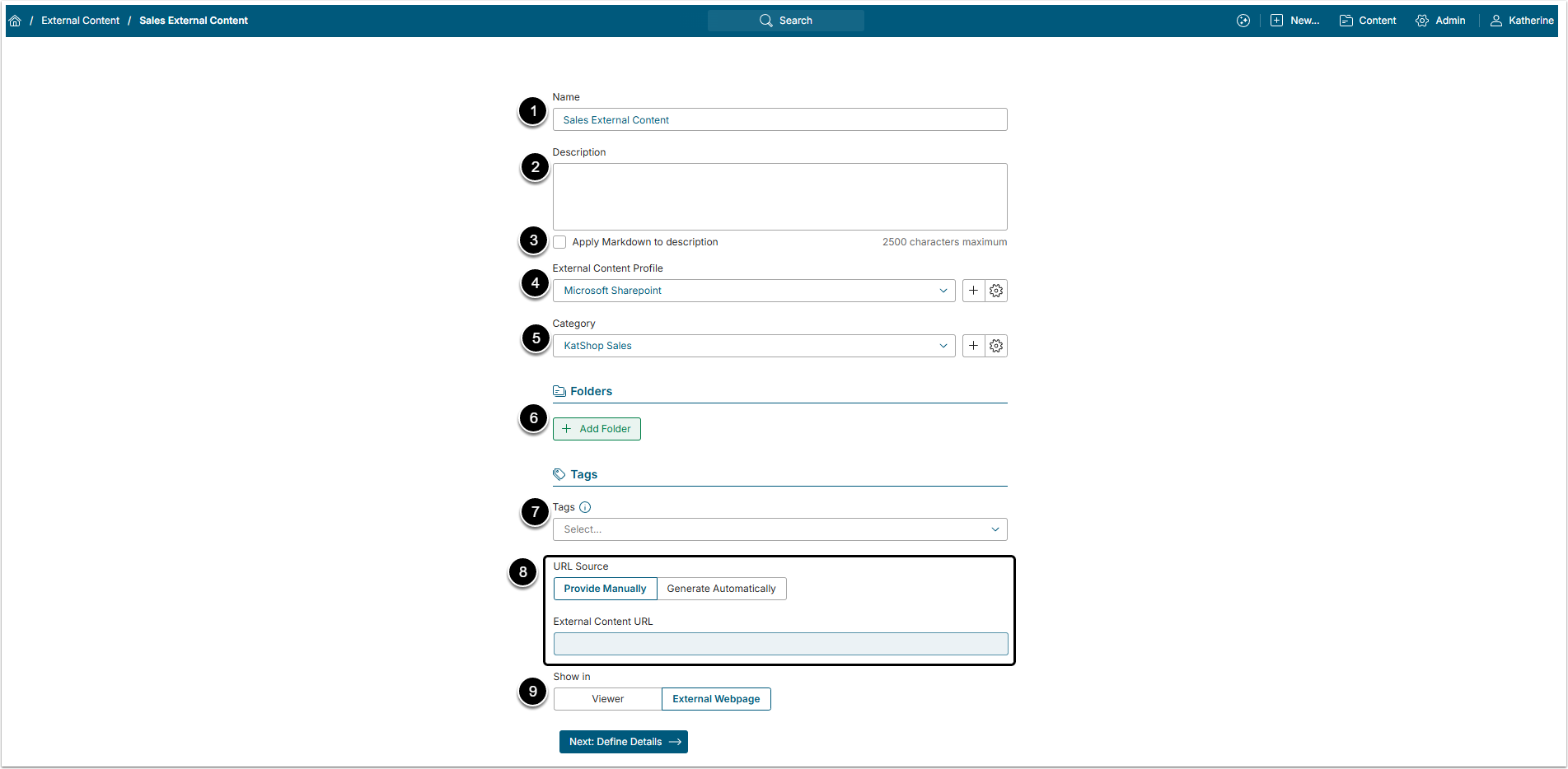 - Tags: Optionally, choose one of existing tags to be applied to the External Content or create a new one. For details refer to: Create a Tag.