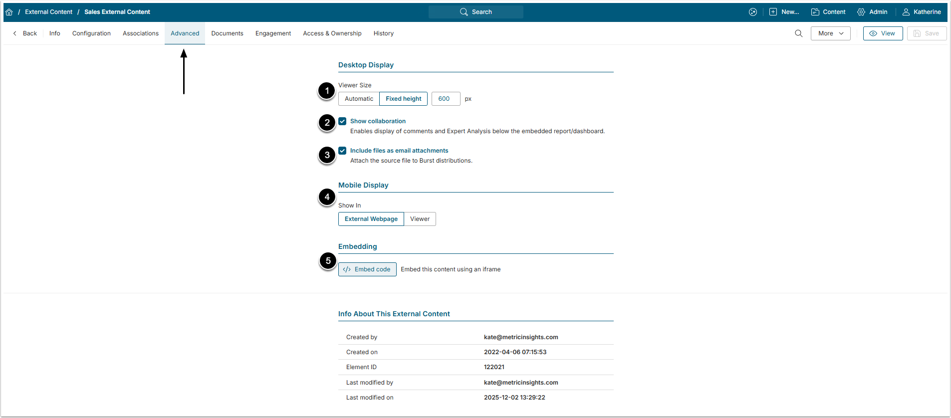 - Embedding: Copy an embedding code here. For more information about embedding, check the Embedding Overview article.