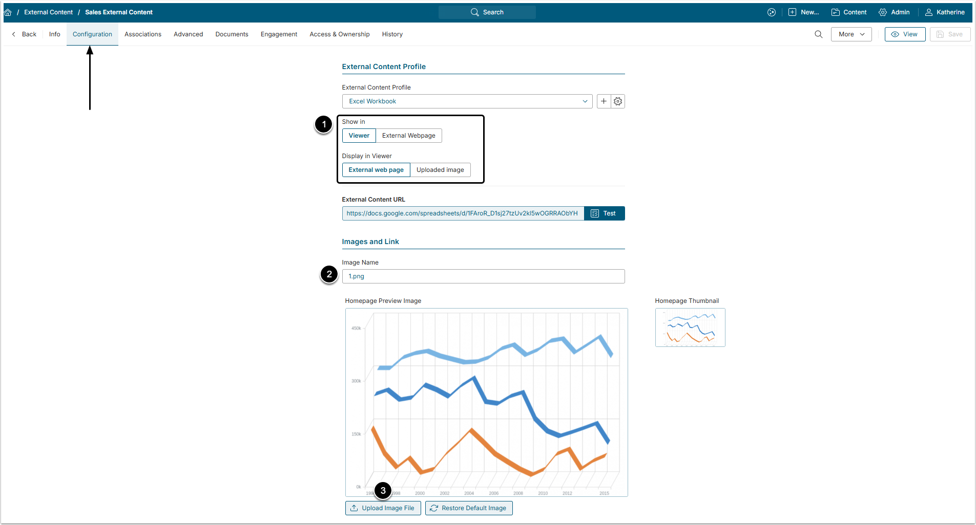 - Show in: Select either the External Content will be shown in the "Viewer" or on "External Webpage".