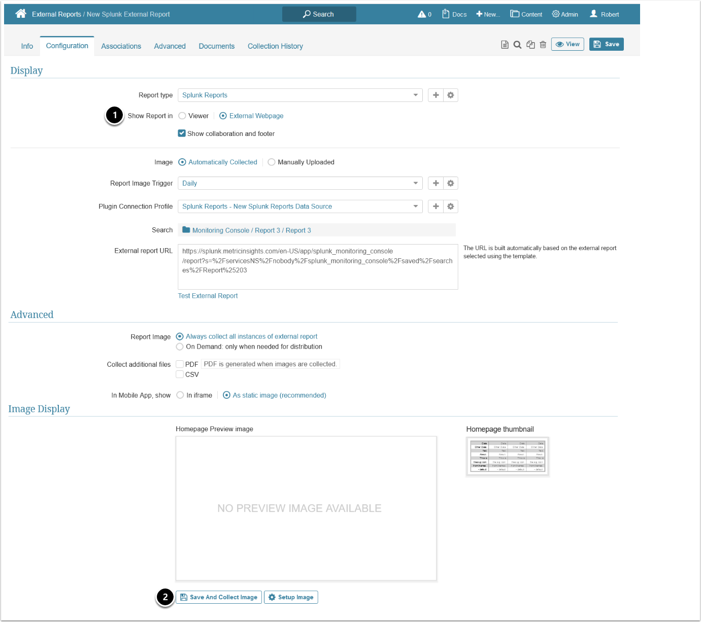 - Show Report in: select whether to show the External Report in Metric Insights Viewer or in the External Webpage defined in the External report URL setting