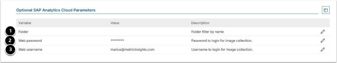 | Web username | Specify the username for your SAP HANA account to collect images for External Reports. |