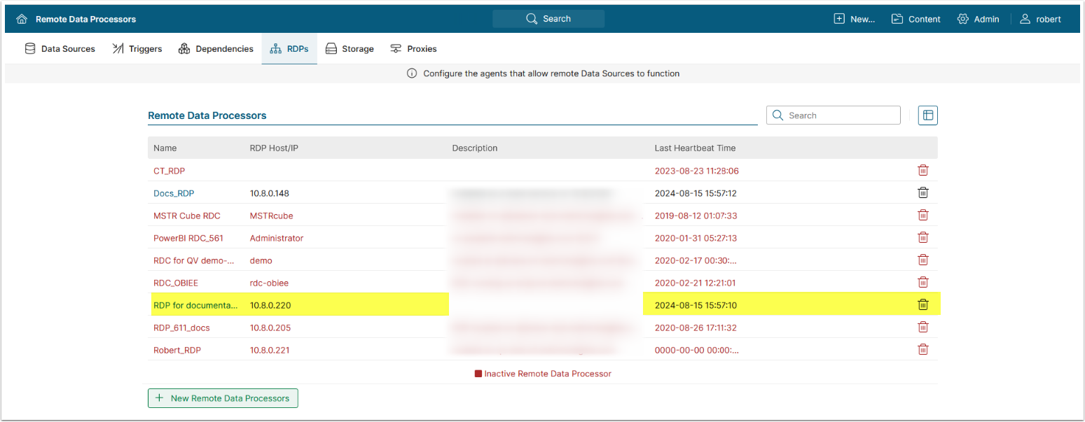 - If your Remote Data Processor is active, it will be shown in default black and the column Last Heartbeat Time will have a value equal to the time you started RDP Daemon Service plus up to 2 minutes.