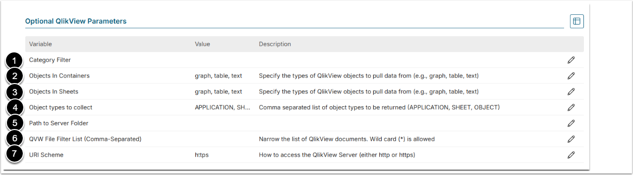 | 4 | Object types to collect | Specify the types of QlikView objects to be collected (APPLICATION, SHEET, OBJECT) |