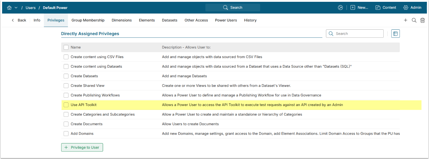 For Power Users, to be able to use API Toolkit, an Admin must grant the corresponding Privilege to them via the User Editor.