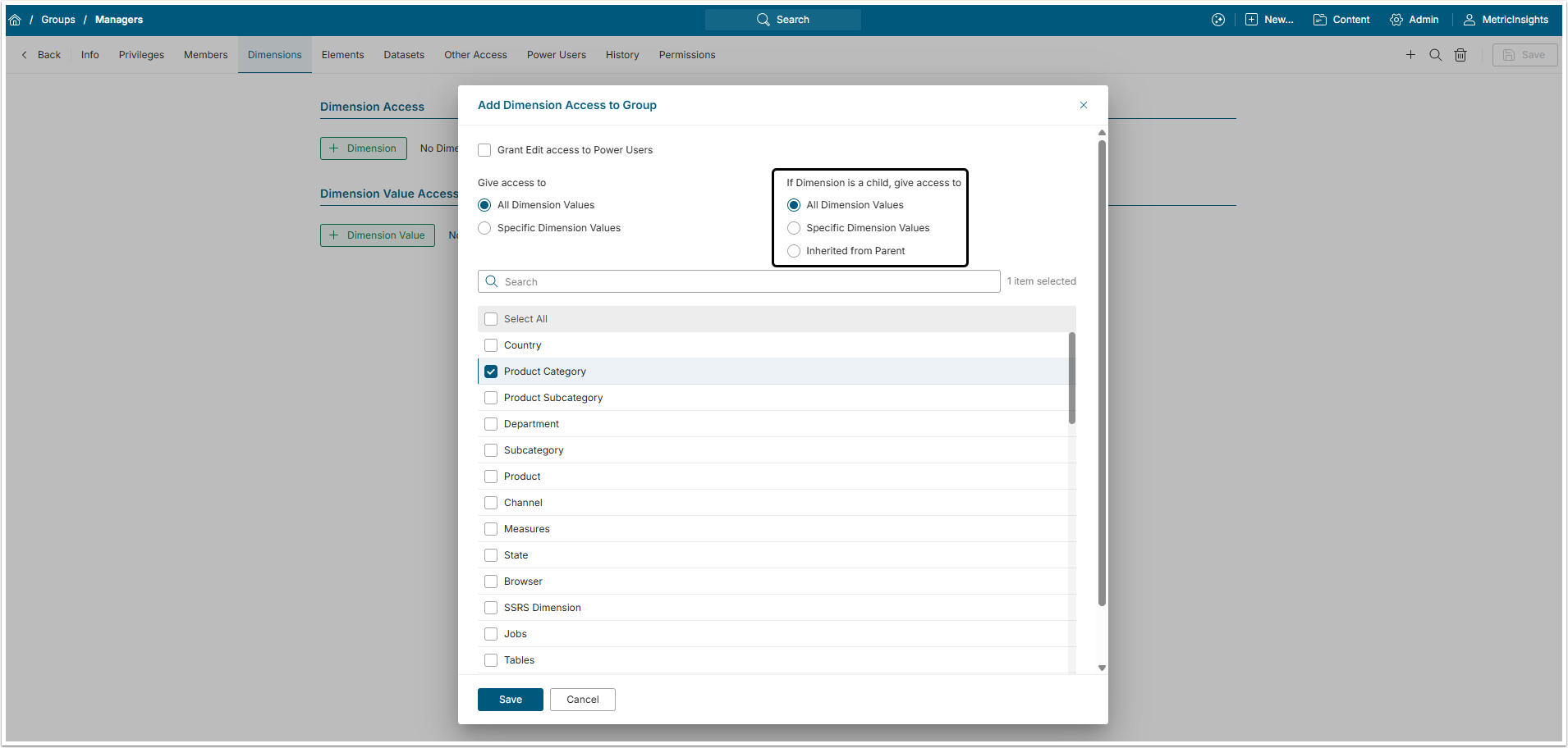 - Inherited from Parent: The same access that Group or User already has to the Parent Dimension (All or Selected) is inherited for the Child Dimension.