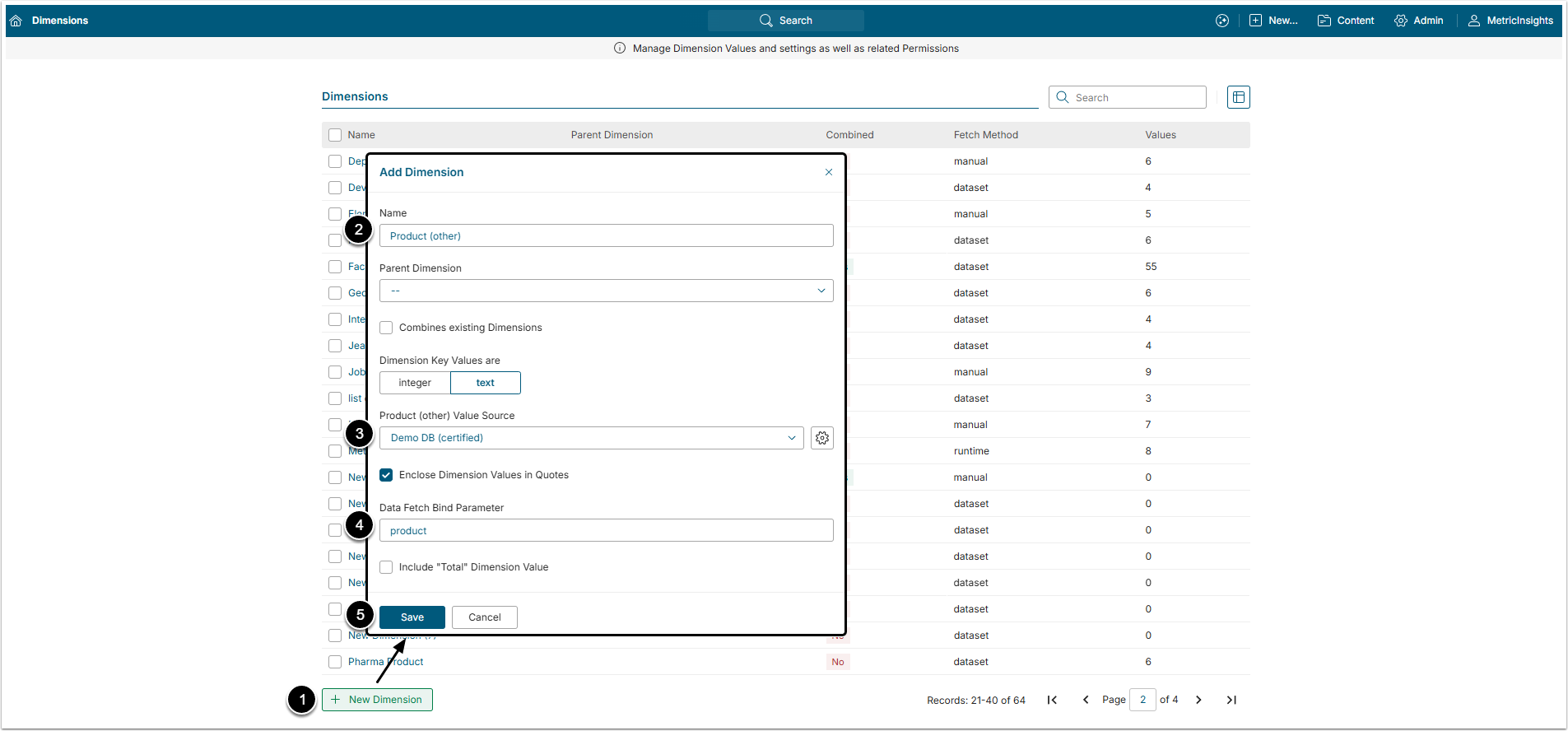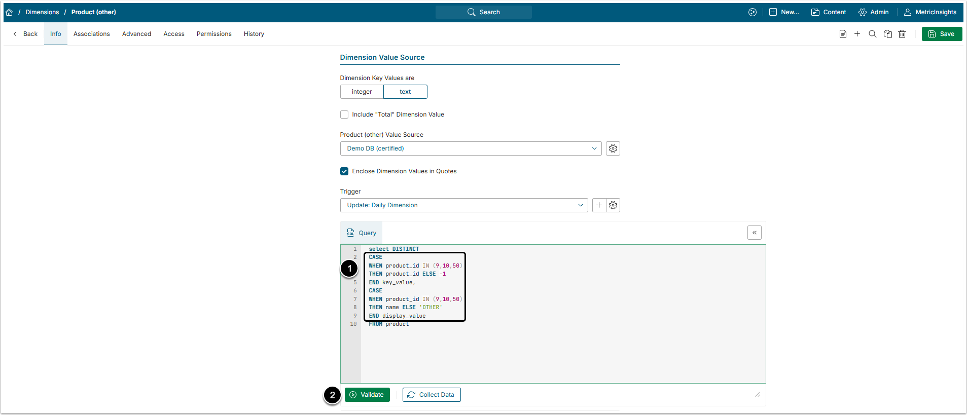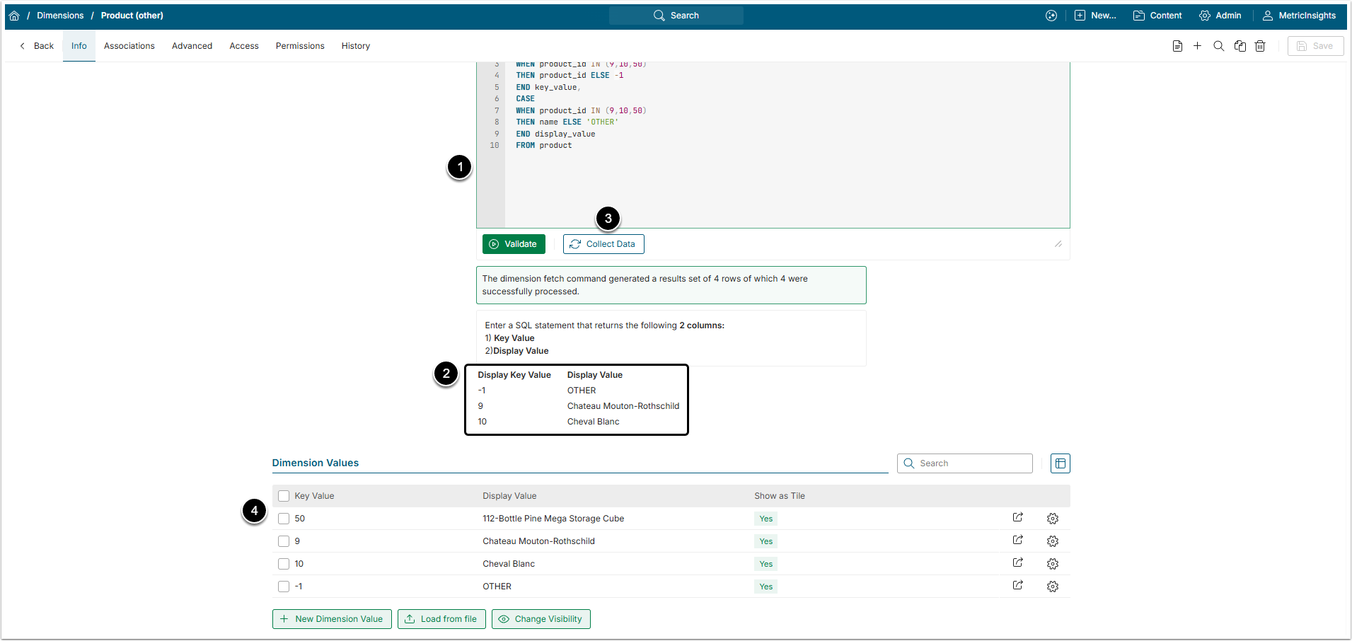 This article explains how to create anduse this Dimension when defining Metrics and Reports. In this example, we define a Product Dimension and select three specific products for Dimension values while assigning the rest of the products to an 'Other' Dimension value.