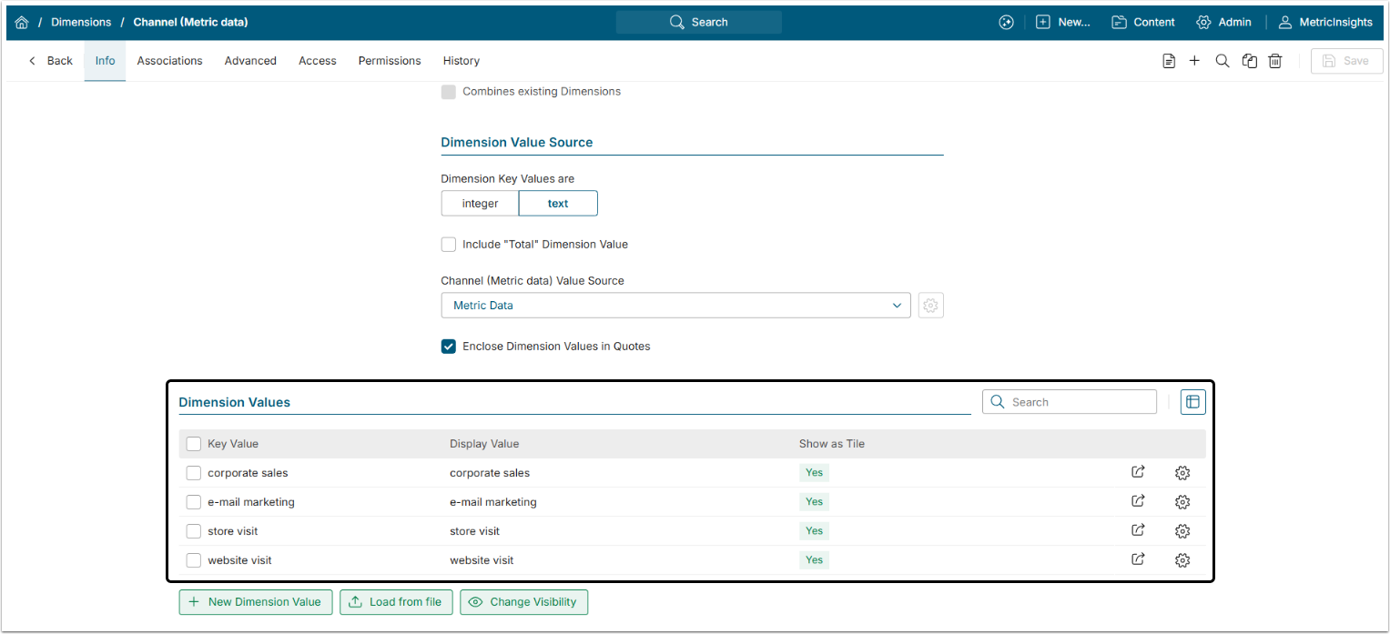 If your Metric and Report data include Dimension Values that are not already shown in the Dimension Editor, they will be added to the grid. You do not need to specify a Metric or Report – Metric Insights will collect Dimension Values from ever Metrics or Reports as it is updated.
