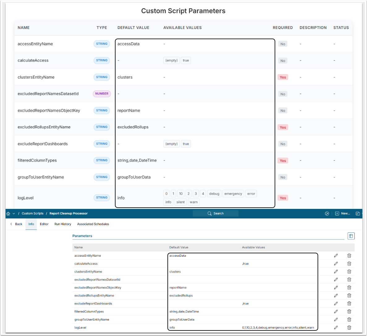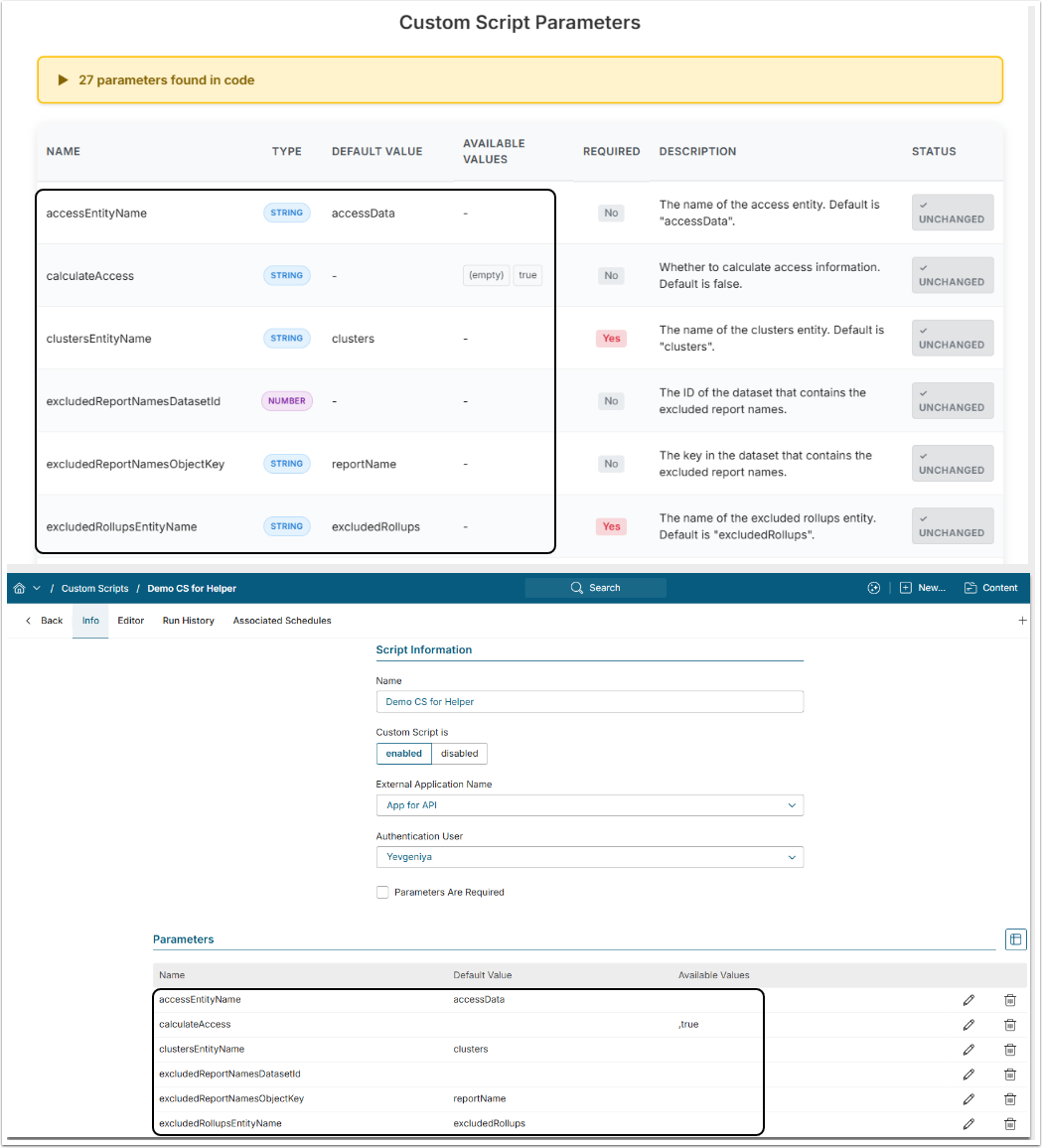 As a result, you can compare the Parameters between the Scripts and synchronize them to ensure they are identical. The Parameters for the old script are displayed in both the App and the Custom Script Editor. If the updates are not immediately visible, refresh the Custom Script Editor to load the changes.