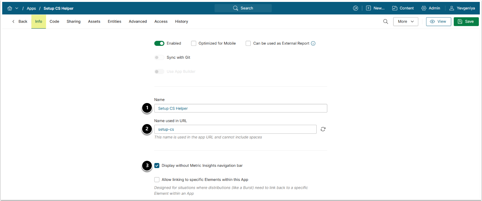 - Display without Metric Insights navigation bar: Must be checked.
