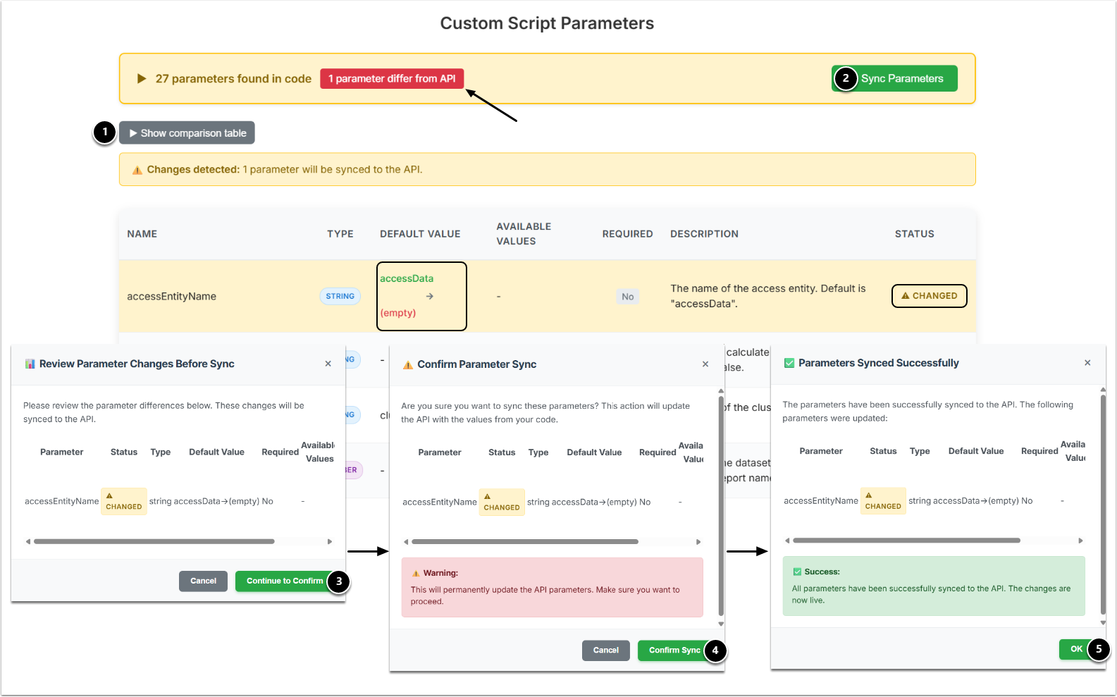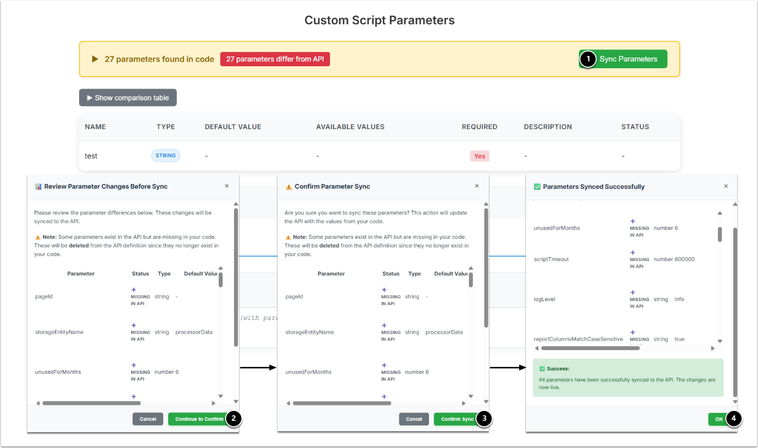 - Show comparison table: If you see that there are Parameter changes, you can view them before syncing.