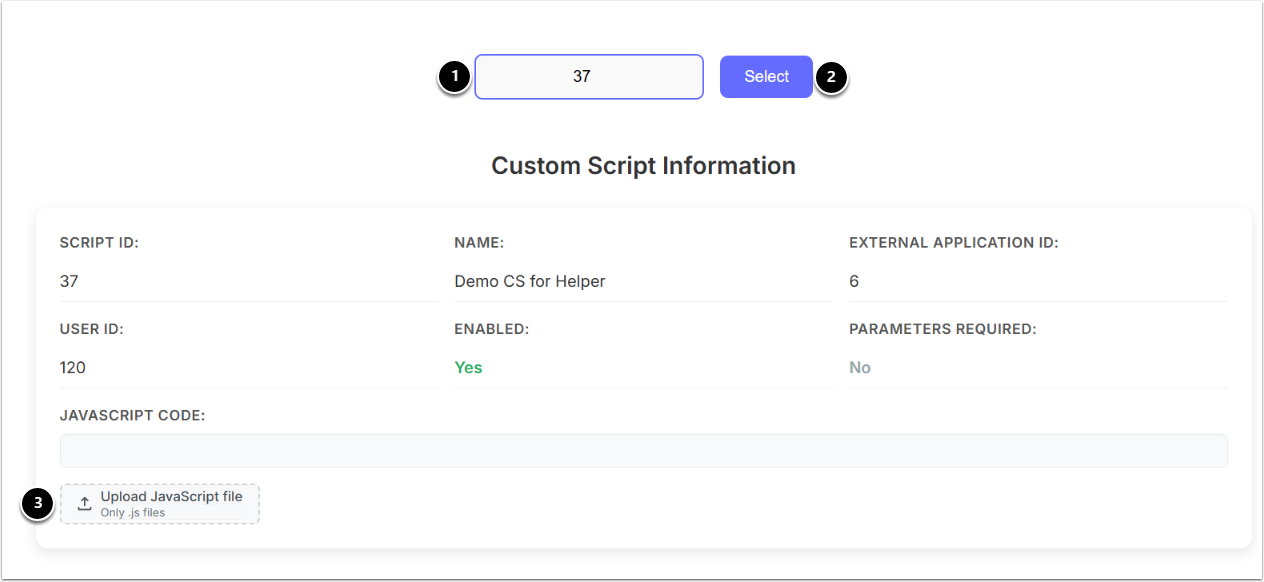 - [Upload JavaScript file]: Upload the latest .js file requested from our support team.