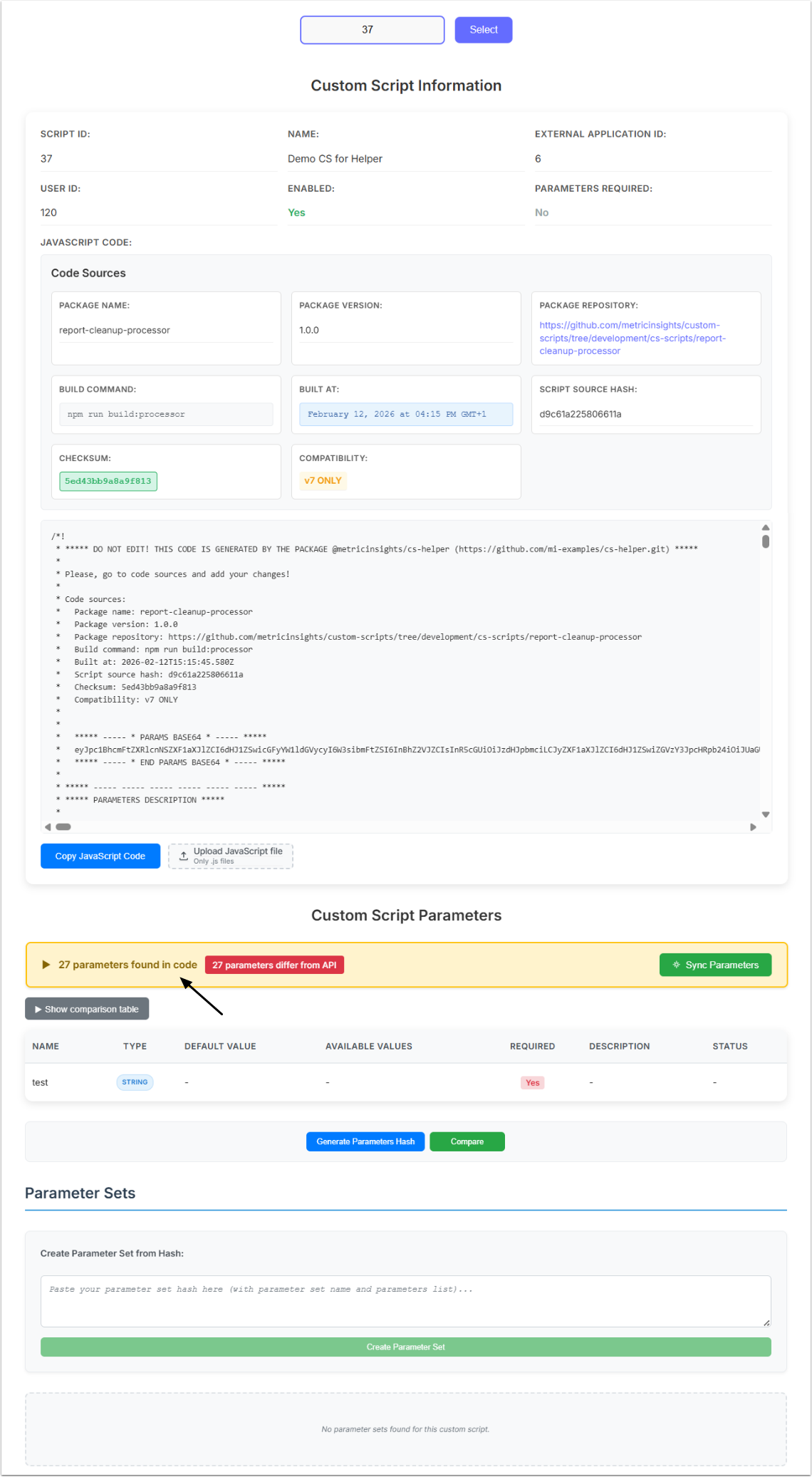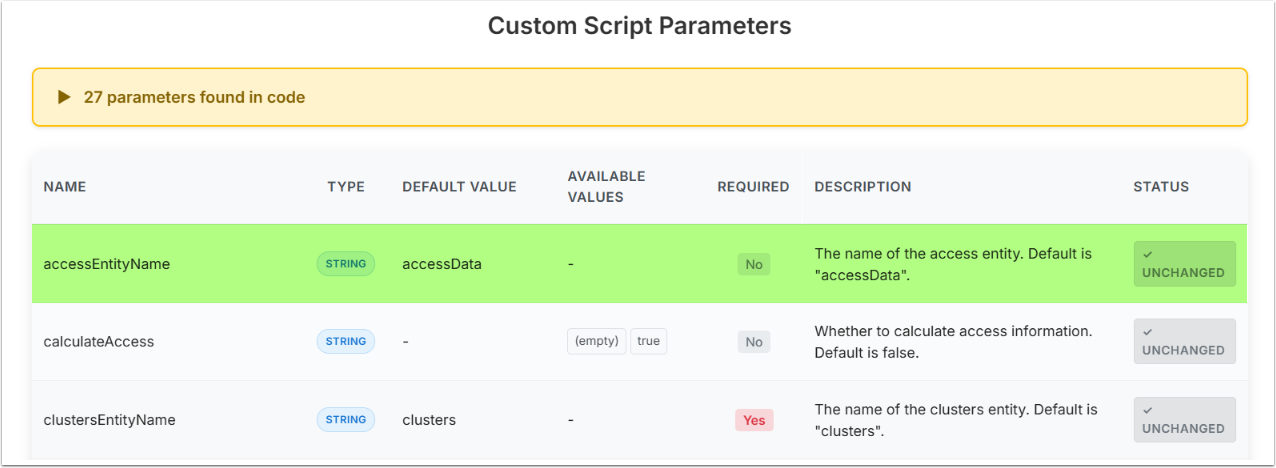 In case you have a Custom Script from an older version (without a Base64-encoded parameter definition) configured, and changes have been introduced between versions, you can compare the two Scripts and then sync them so they include the same Parameters.