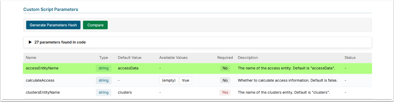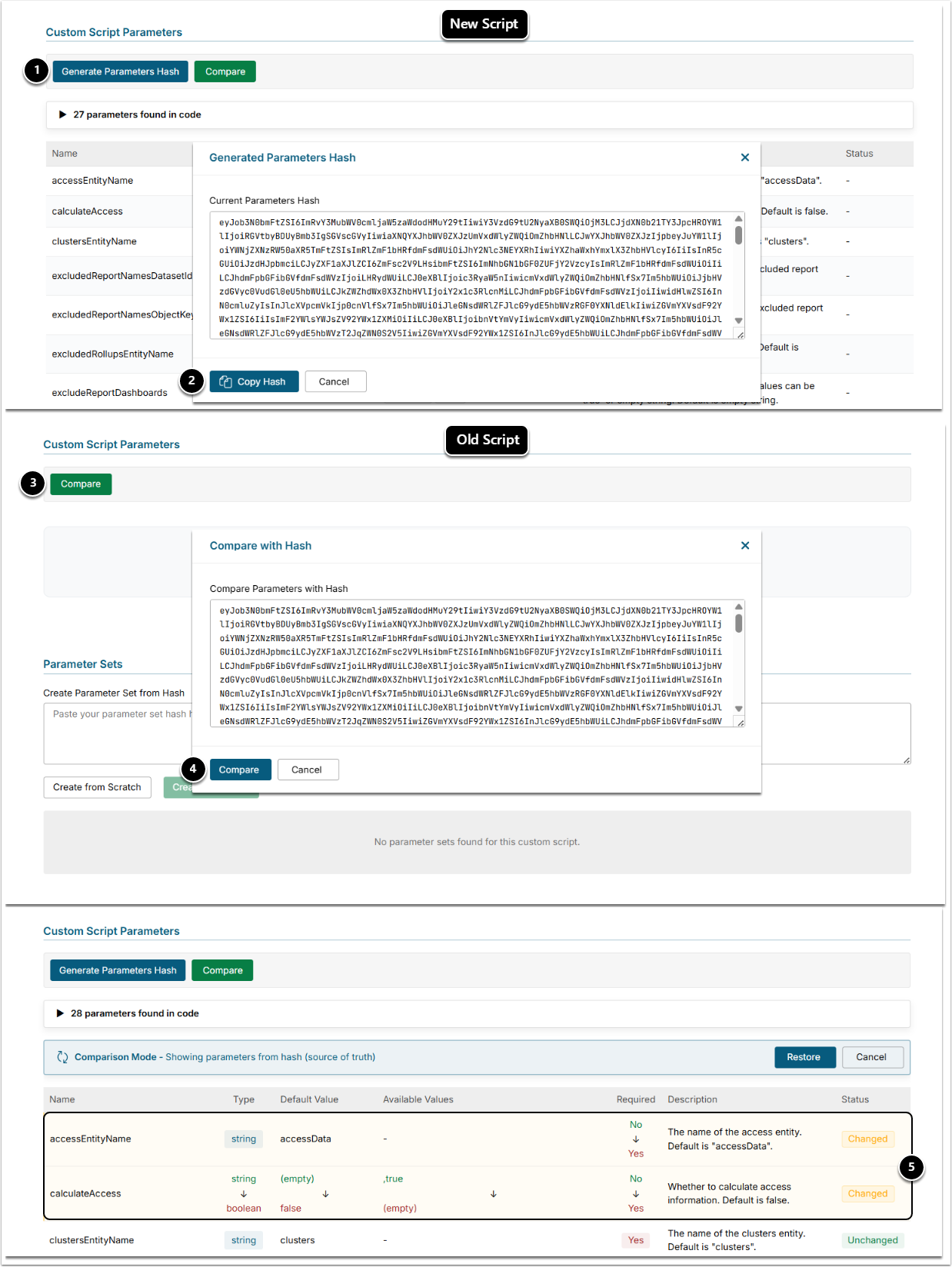 In case you have a Custom Script from an older version (without a Base64-encoded parameter definition) configured, and changes have been introduced between versions, you can compare the two Scripts and then sync them so they include the same Parameters.