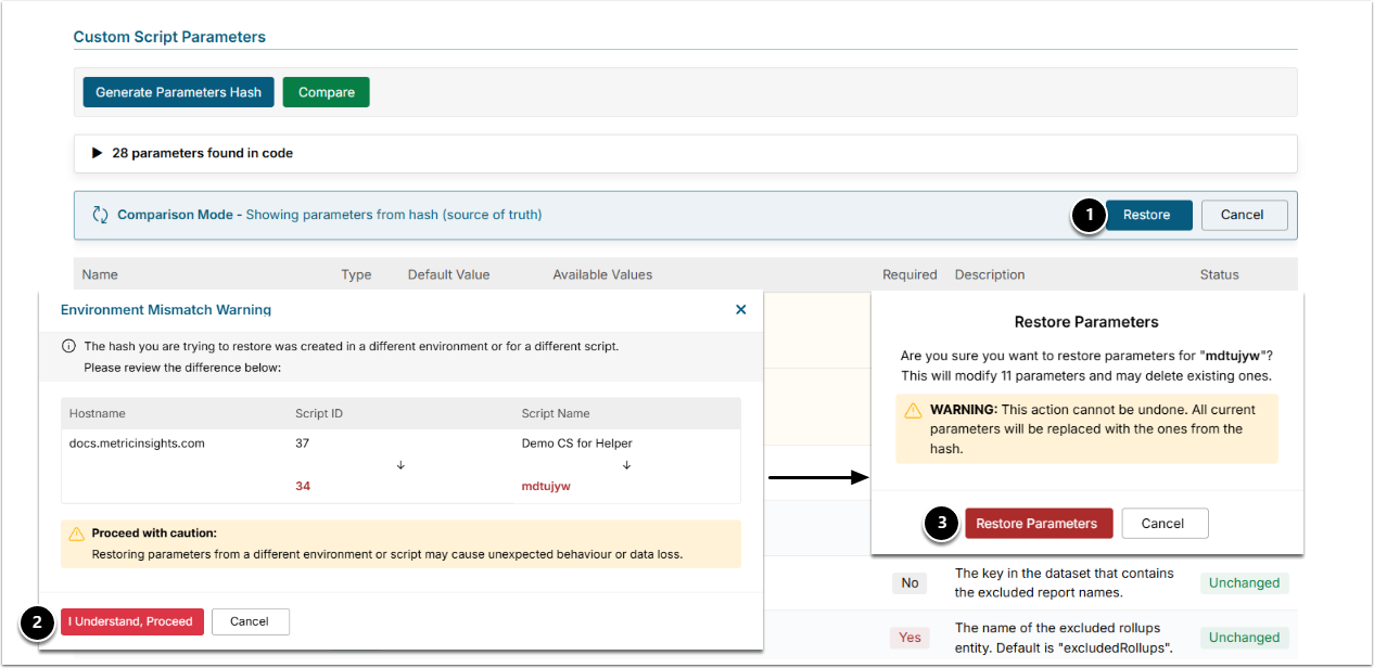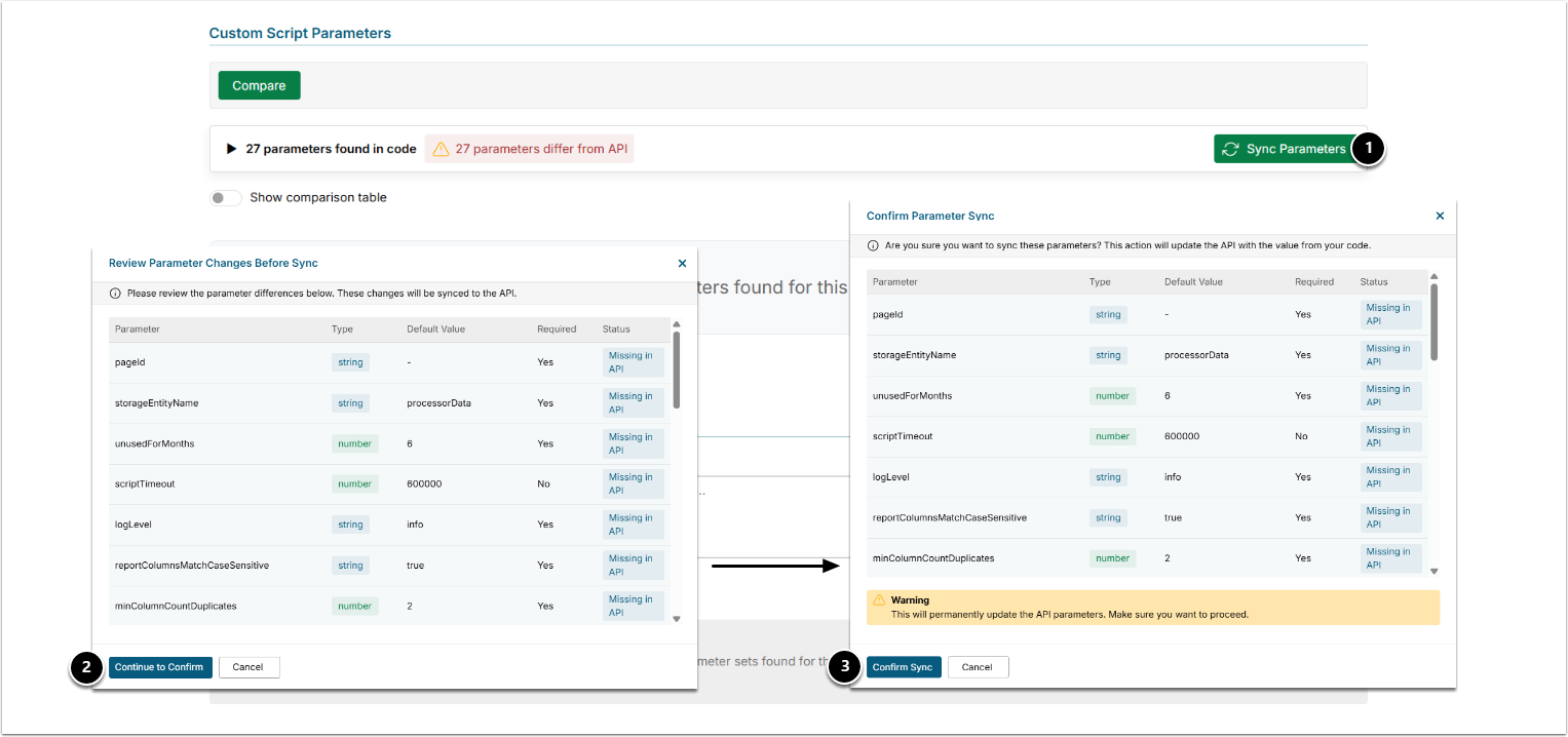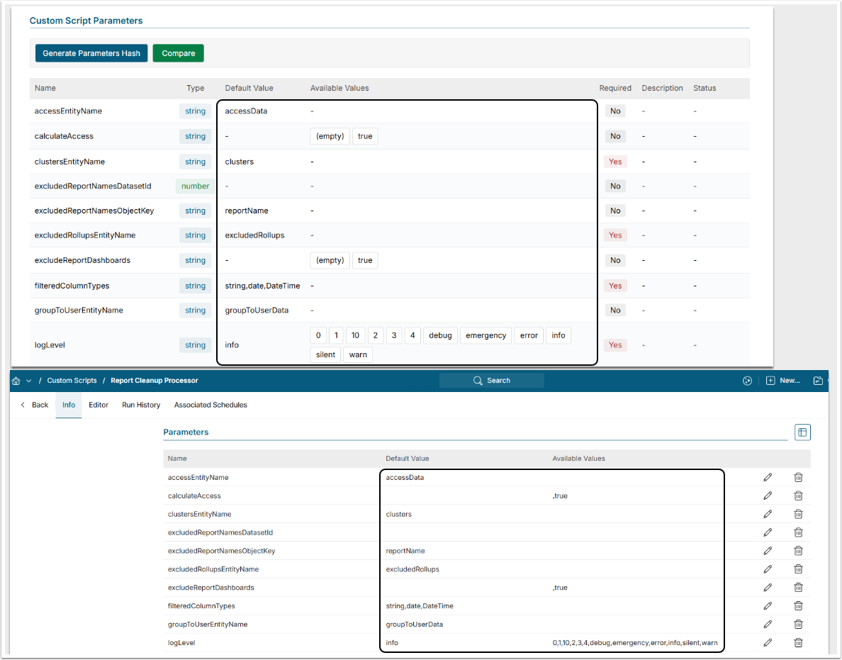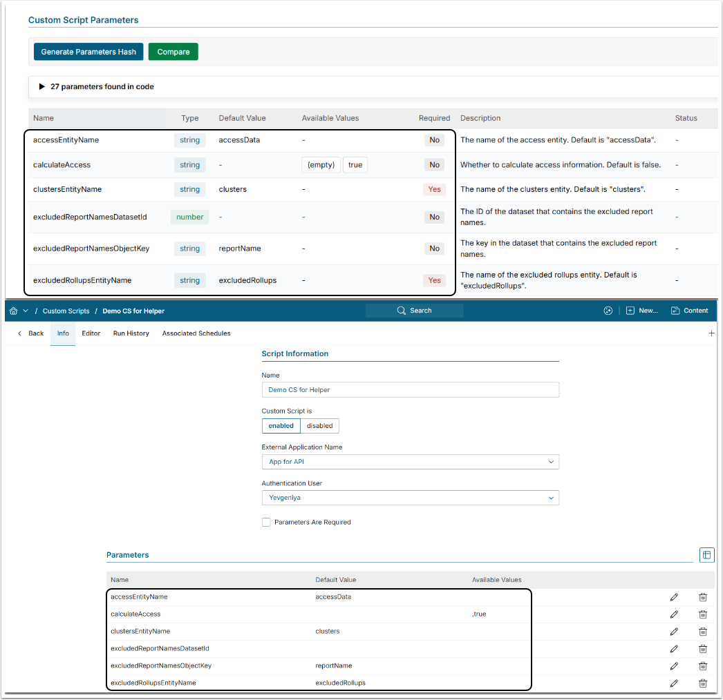 As a result, you can compare the Parameters between the Scripts and synchronize them to ensure they are identical. The Parameters for the old script are displayed in both the App and the Custom Script Editor. If the updates are not immediately visible, refresh the Custom Script Editor to load the changes.