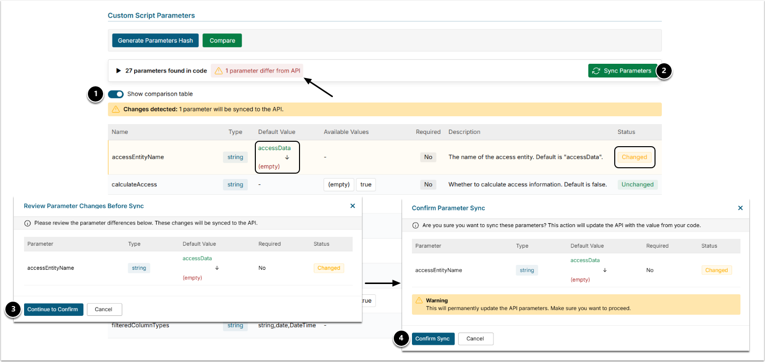 - Show comparison table: If you see that there are Parameter changes, you can view them before syncing.