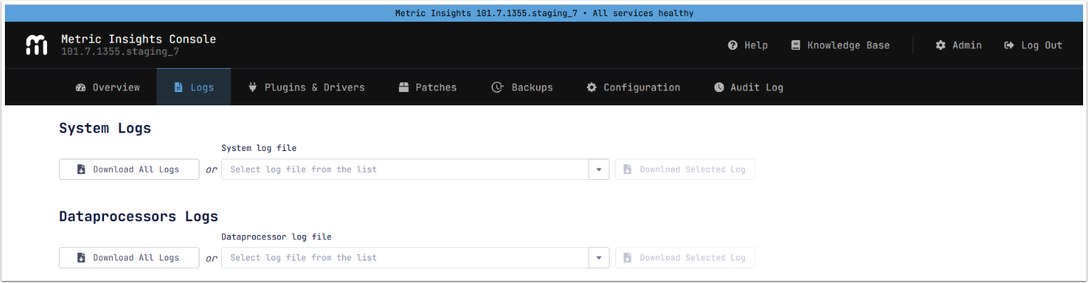NOTE: Logs from Status Monitor do not include Docker container logs, which can be accessed via MI Console or directly via Docker containers.