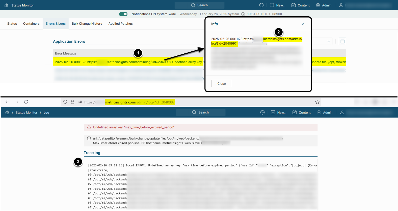 ENABLE_APPLICATION_ERROR_LOGGING_INTO_DBto 'Y' to enable more detailed MI application error logs, accessible via Admin > Status Monitor > Errors & Logs- See Access Verbose Logs in Status Monitor for details