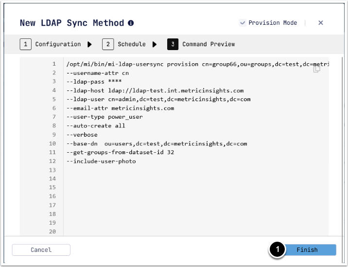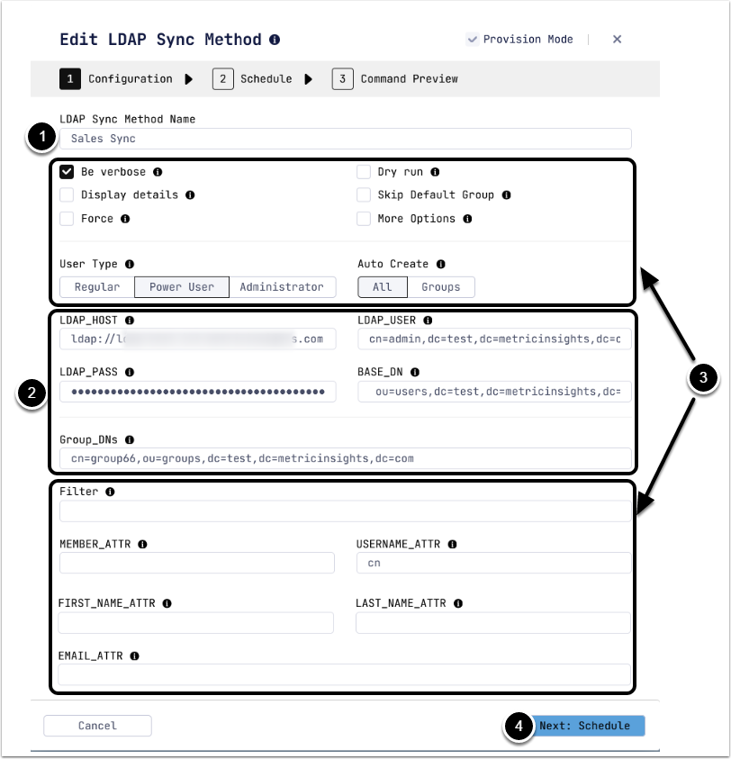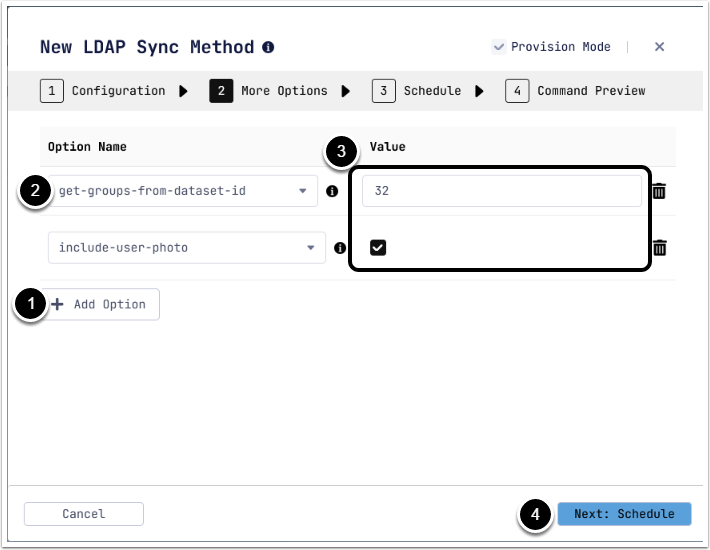- Click [Next: Schedule] to configure LDAP schedule, or [Next: More Options],to provide additional LDAP sync options if More Options was enabled.