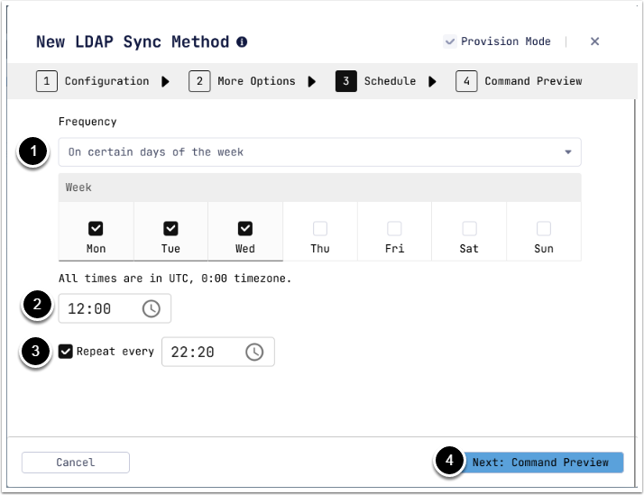 - Optionally, if certain days of week have been selected, set the repeat frequency for LDAP sync