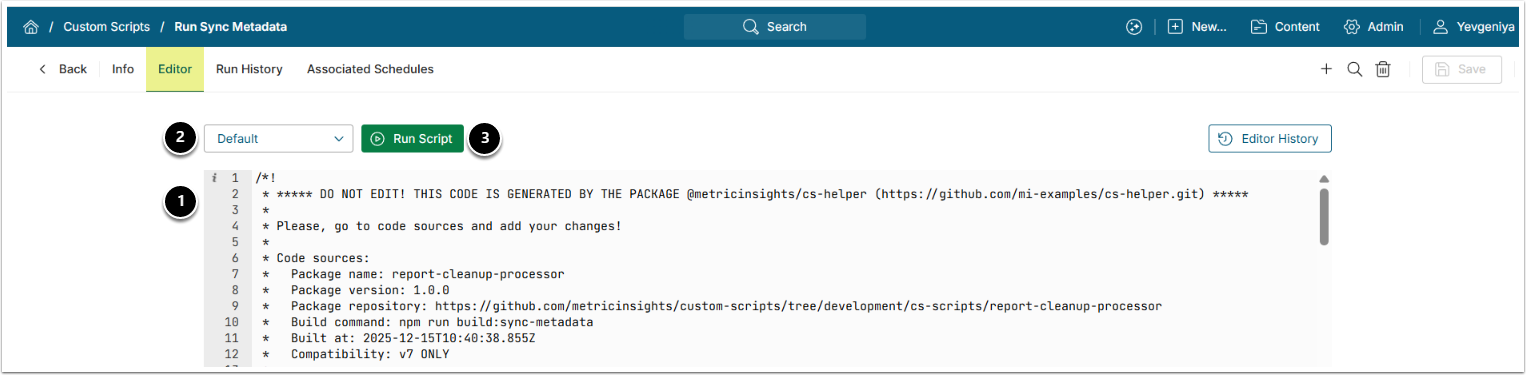 - Under the Editor tab, copy and paste the code from the Run Sync Metadata Custom Script file requested from our support team.