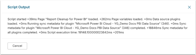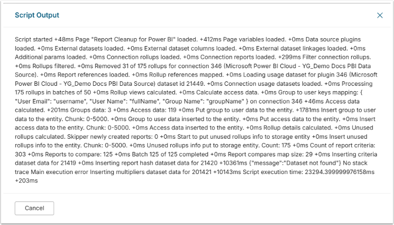 pageId: The ID of the App created in Step 6 above.storageEntityName: The name of the storage entity where the script will store its data. (See Step 6.2) The default is processorData.unusedForMonths: The number of months without activity after which a report is marked as unused. The default is 6.scriptTimeout: The timeout for the script in milliseconds. The default is 600000 (10 minutes).logLevel: The log level for the script. Values can be debug, info, warn, error, emergency, or silent. The default is info.logColors: Specify whether to log colors in the console. The default is blank.reportColumnsMatchCaseSensitive: Specify whether the report columns are case-sensitive. The default is true.minColumnCountDuplicates: The minimum number of columns to consider for duplicates. The default is 2.worksheetNameMultiplier: The multiplier for the worksheet name. The default is 0.1.tableMultiplier: The multiplier for the table name. The default is 1.tableColumnMultiplier: The multiplier for the table column name. The default is 1.reportColumnMultiplier: The multiplier for the report column name. The default is 1.tagMultiplier: The multiplier for the tag name. The default is 1.minOverlapInCluster: The threshold percentage of similarity between two reports in a cluster, specified as a decimal. A report cluster will be included in the match results when the similarity percentage between any two reports in the cluster exceeds this threshold. Acceptable values range from 0 to 1 (e.g. 0.2, 0.35, 0.5), where 0 represents 0% similarity and 1 represents 100%. The default is 0.2 (20%).filteredColumnTypes: The column types to be filtered out as a comma-separated list of types with no spaces. The default is string,date,DateTime.clustersEntityName: The name of the clusters entity. (See Step 6.2) The default is clusters.excludedRollupsEntityName: The name of the excluded rollups entity. (See Step 6.2) The default is excludedRollups.thresholdReportsToBeUsed: The minimum number of views to consider a report as used. The default is 0.skipUnusedCheckForCreatedInDays: The number of days after the report was created to skip the unused check. The default is 15.unusedInfoEntityName: The name of the unused info entity. (See Step 6.2) The default is unusedInfo.removeUnusedFromClusters: Specify whether to remove unused reports from clusters. The default is blank.accessEntityName: The name of the access entity. (See Step 6.2) The default is accessData.groupToUserEntityName: The name of the group-to-user entity. (See Step 6.2) The default is groupToUserData.calculateAccess: Specify whether to calculate access information. The default is blank.excludedReportNamesDatasetId: The ID of Report Cleanup Excluded names Dataset. (See Step 4) If not used, this can be left blank.excludedReportNamesObjectKey: If using excludedReportNamesDatasetId, the column name from the dataset that contains the excluded report names. The default is reportName.minItemsCount: The minimum number of items required in the report for processing to begin. The default is 8.excludeReportDashboards: Specify whether the BI Optimizer should exclude Power BI dashboards from duplicate-detection when those dashboards only contain (or represent) the same report included within them. Use when a dashboard embeds a single underlying report and is flagged as a duplicate of that report. Acceptable values: blank(default): dashboards and reports are evaluated normally; true: skip similarity flagging between a dashboard and its included reports.