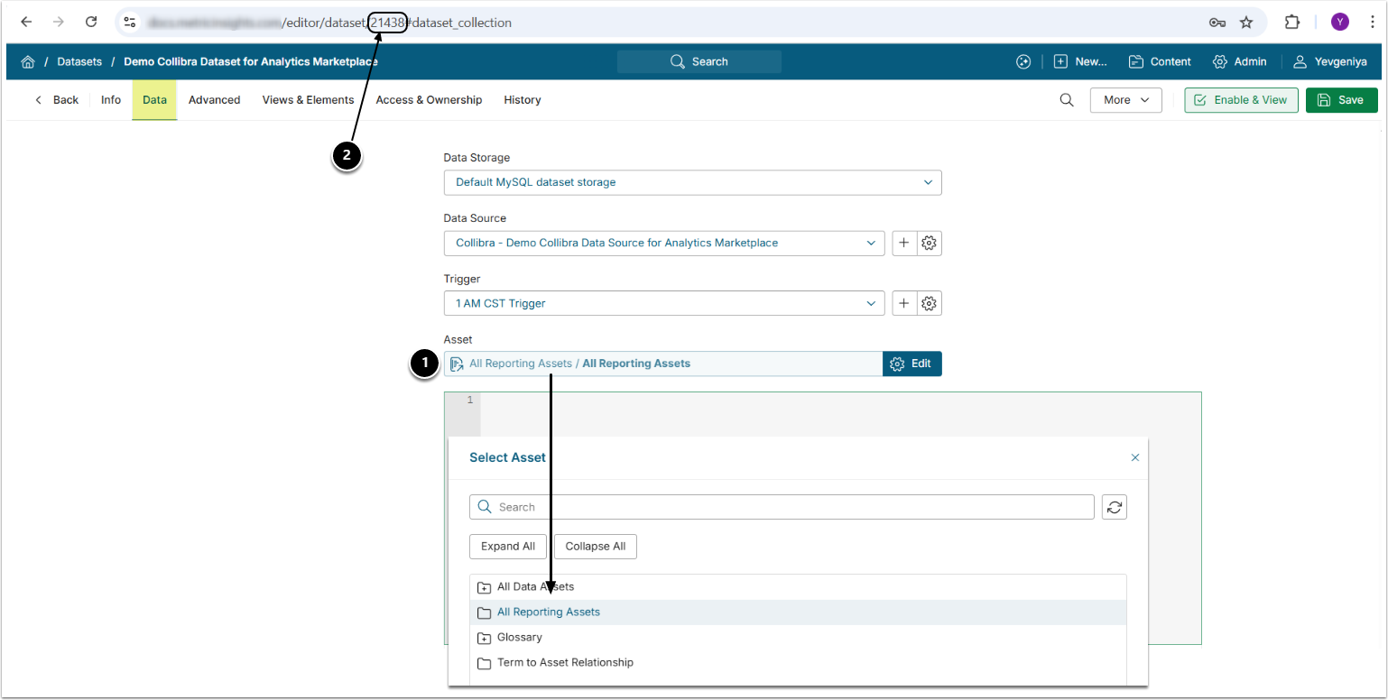 - Data Source: select the Data Source used as Data Storage when creating Dataset from the Collibra All Reporting Assets object;