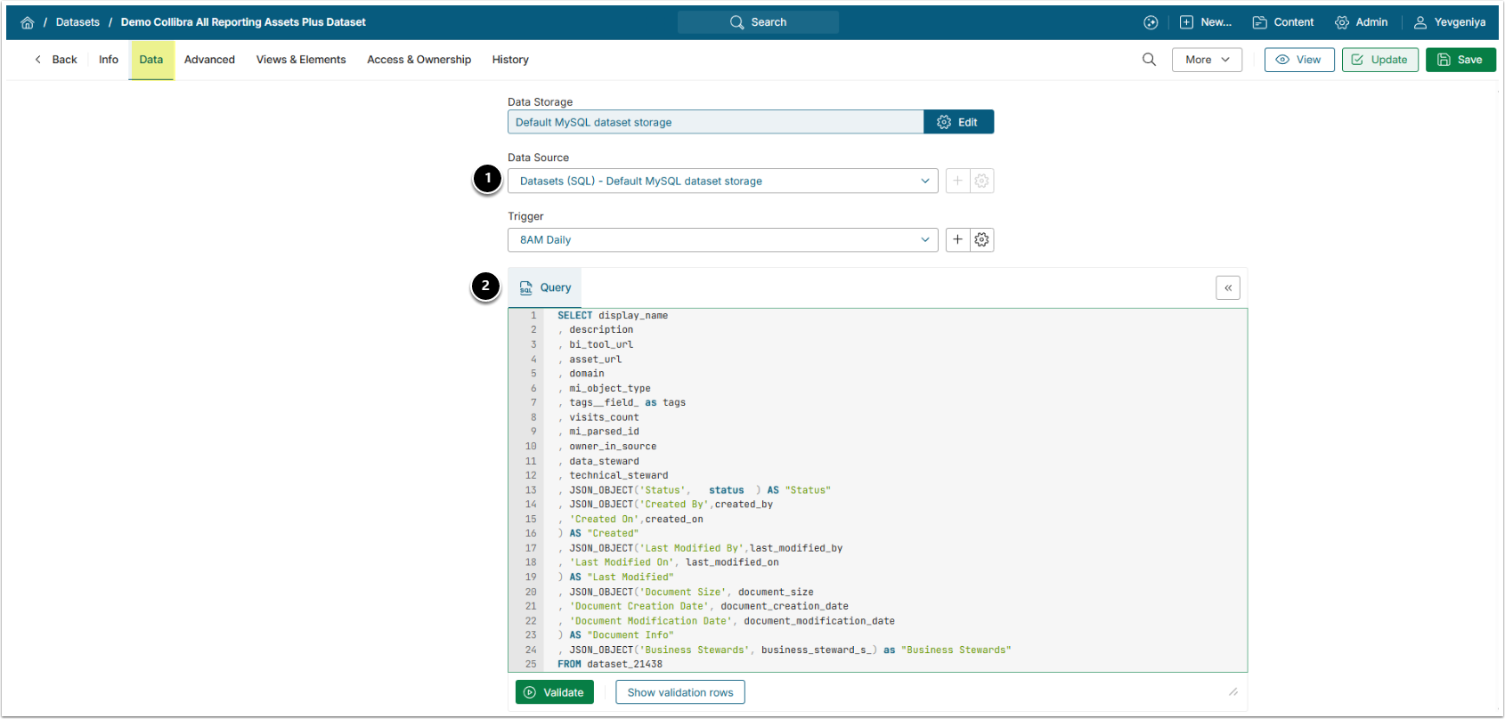 - Data Source: select the Data Source used as Data Storage when creating Dataset from the Collibra All Reporting Assets object;