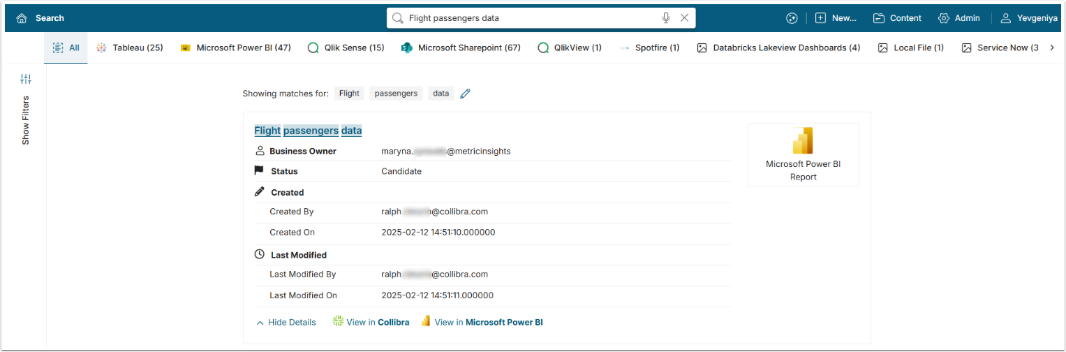 You can search for third-party tools' assets without leaving the Metric Insights UI and without recreating them as objects in Metric Insights. Global Search will return the assets with the list of the available metadata and links to proceed to either the asset in the data catalog tool, such as Atlan, Collibra, Databricks Unity Catalog, etc. or the actual object in the associated BI tool like Tableau, Power BI, etc.