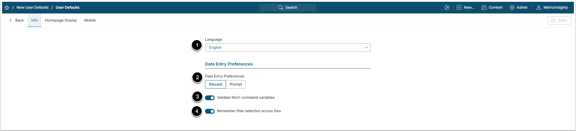 - Data Entry Preferences: When the User leaves a page without saving the changes, they can be asked if they would like to save them. This option defines either the User is prompted before leaving or the changes are just discarded.