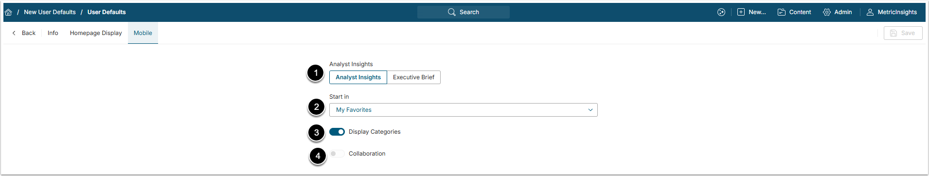 - Analyst Insights: Select format for your mobile version's display of the Homepage and display options: