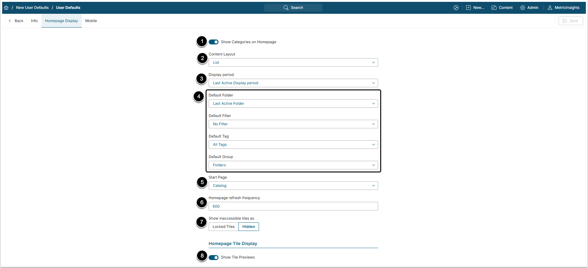 - Display period: Select the default period of time, used on the Tile Previews.