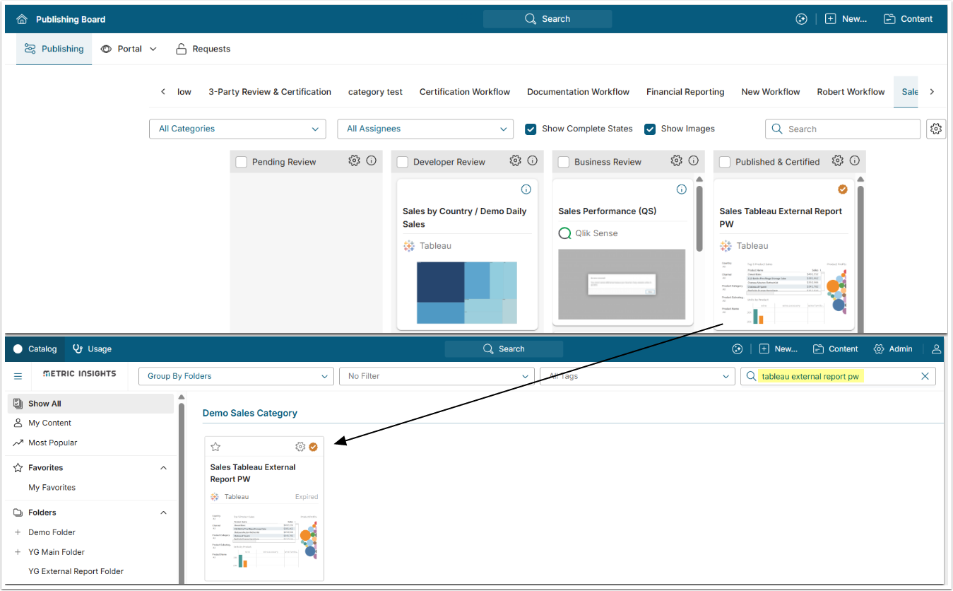 When Report Developers build the Report in Metric Insights, placing the Report in Sales Category_Staging automatically puts it in Pending Review Stage of Sales Reporting Workflow. This makes the Report available for moving to the next Stage, Developers Review.
