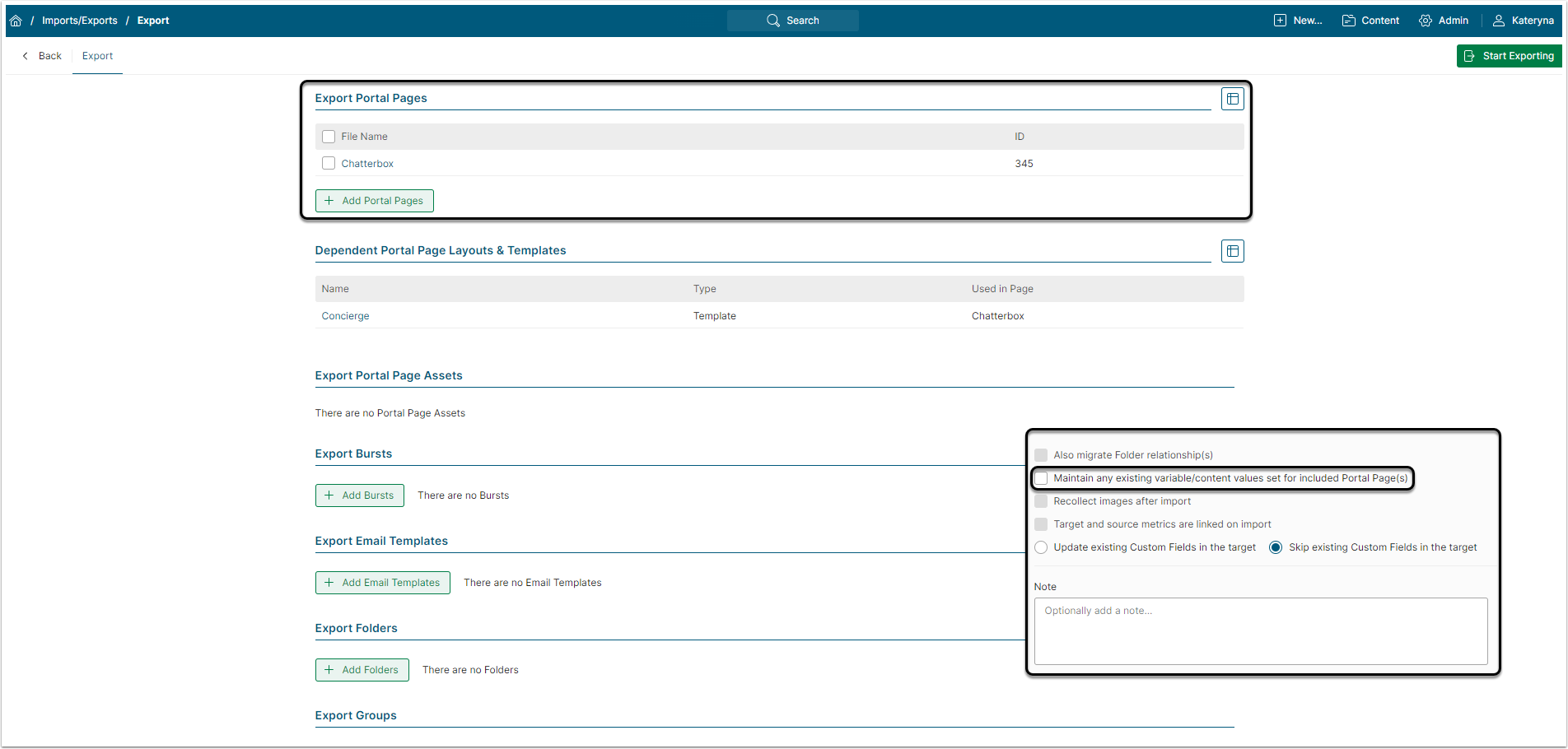 When Maintain any existing variable/content values set for included Portal Page(s) option is selected upon export, existing variables and values on the target instance are not updated upon import, new variables are added with values, and variables which are not on source but existed on target are removed.