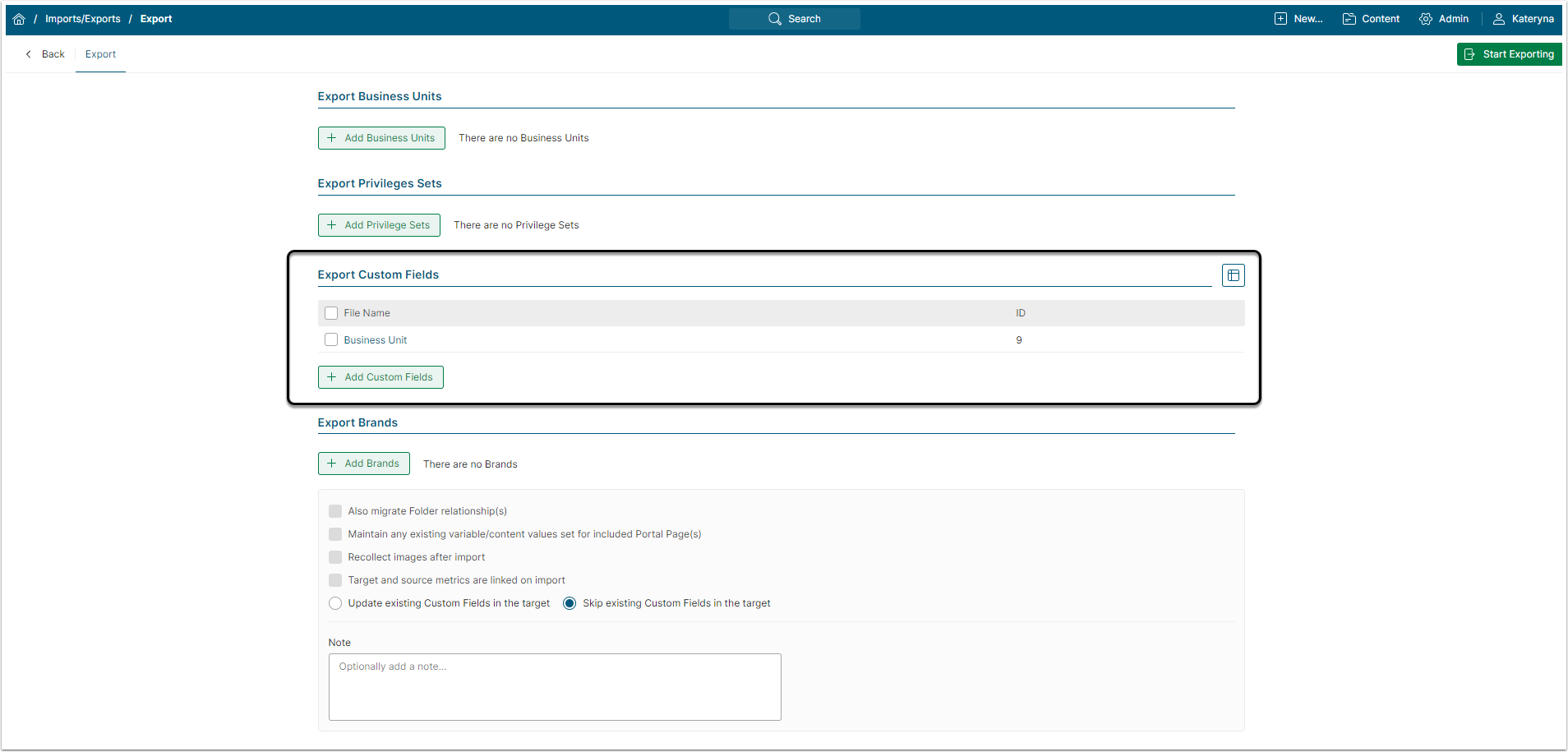 - A Custom Field is migrated with its values (also when selected as a component of an Element) and the Section it belongs to. If a Section with the same name already exists on the target instance,it will be updated