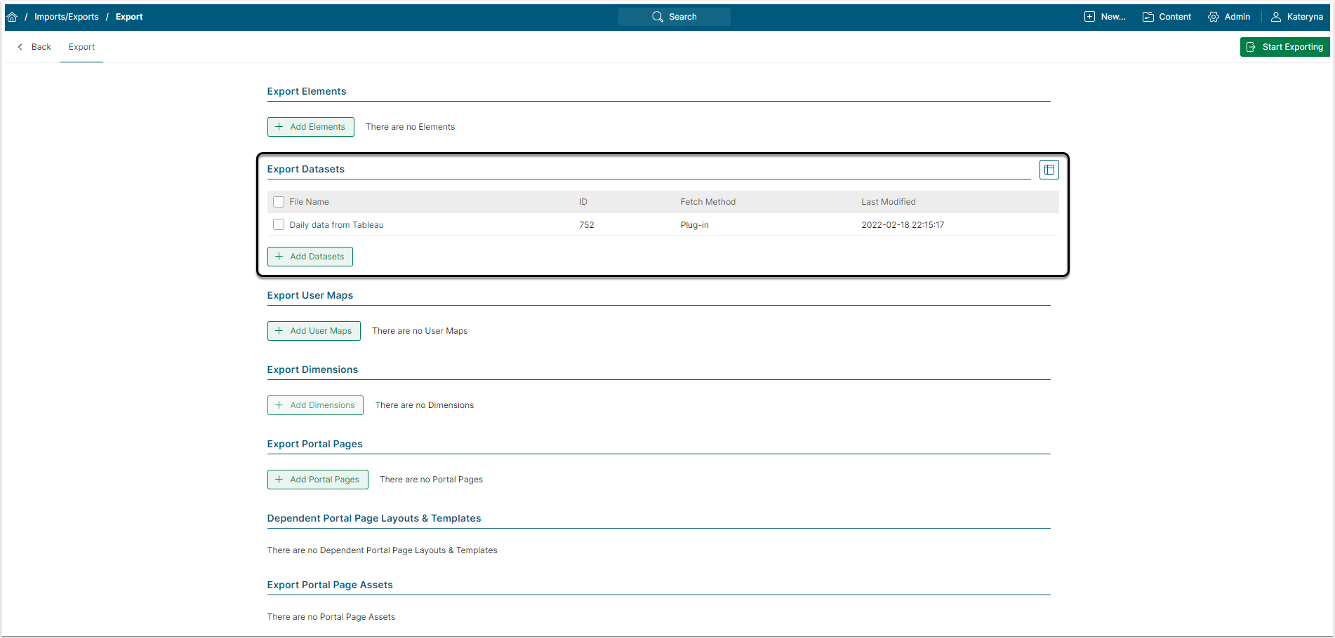 When the User selects a Dataset, all related Datasets are also selected automatically. Deselect them from the Export Datasets grid if they are not necessary.