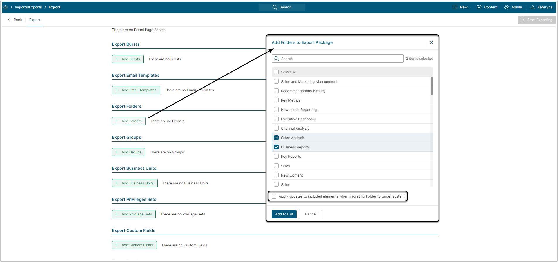 - If the Folder already exists in the target system, it will be updated, and if not, the Folder will be created. This checkbox works with the Elements only