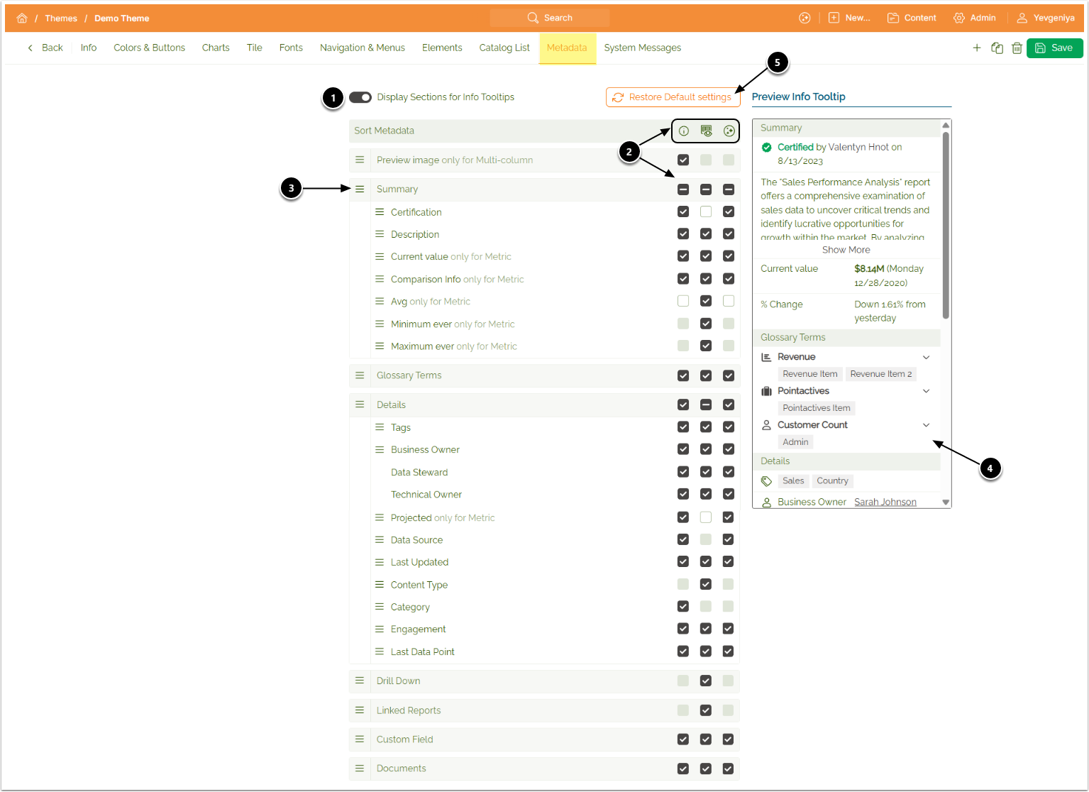 - Control if you want display sections, such as Glossary Terms or Details, on Tile info tooltips;