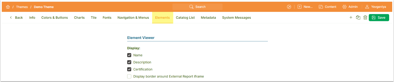 The Elements Tab is intended for controlling the display of External Reports in Viewer, which is helpful for embedding.