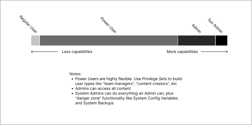 | Regular User | Based on assigned Privileges and Permissions, can View selected Elements and objects, organize their content into Favorites, Folders, and Bursts, and maintain personal settings but cannot create content or edit other objects |