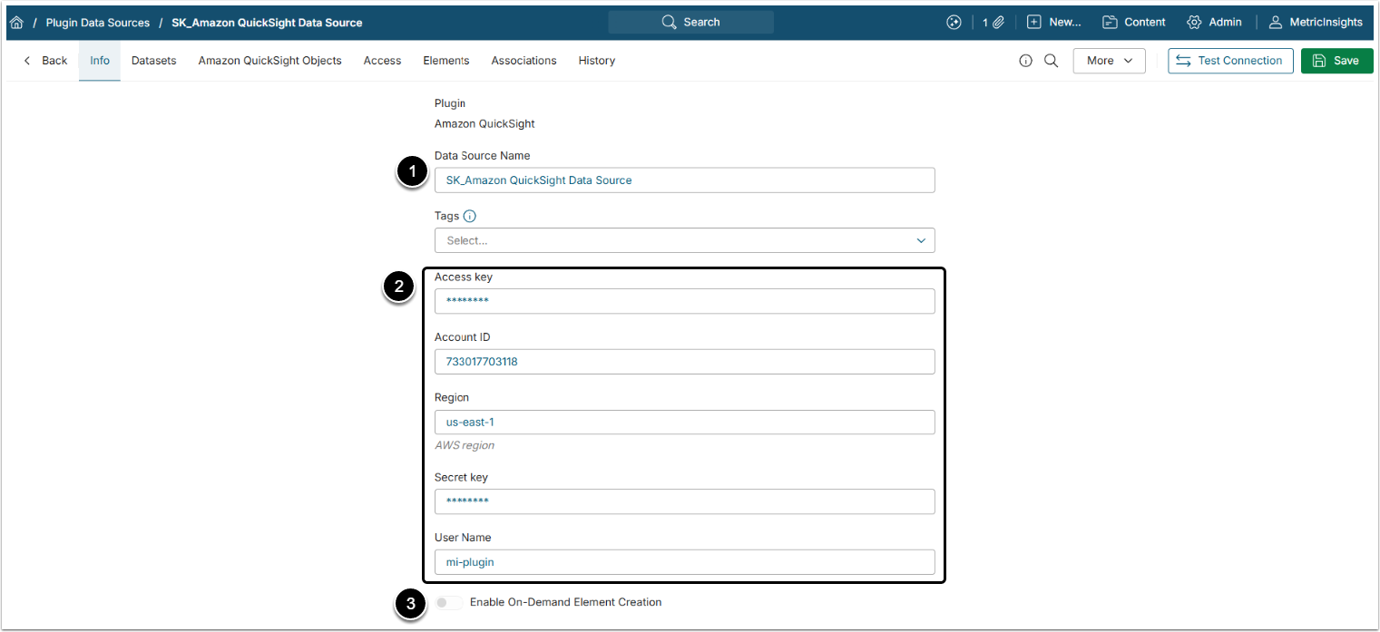 - Provide Access Key, Account ID, AWS Region, Secret key and User Name, collected in the Prerequisites for Connecting to Amazon QuickSight.
