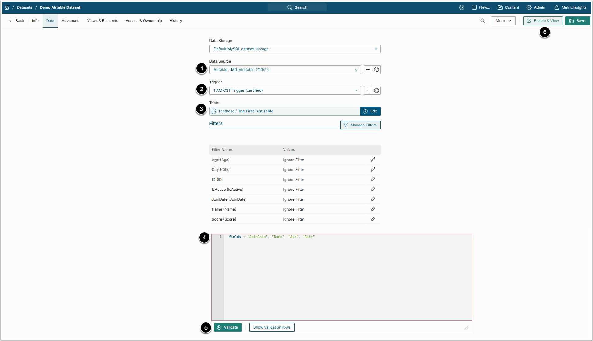 - Table: Select the Airtable object that should serve as a basis for Dataset.