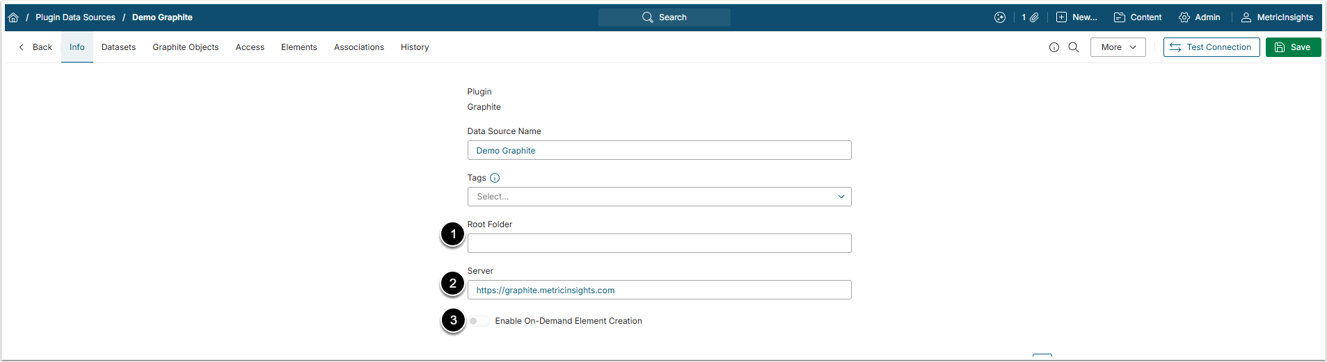 Click [Test Connection] in the upper right corner to check if Metric Insights is able to connect to Graphite correctly.