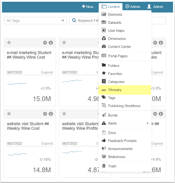 Glossary Terms are added to Glossary Sections and are used to define and describe attributes or data regarding Elements. Terms can be applied to Metric Insights (MI) content; e.g., External Reports, Datasets, Metrics, and Dataset Reports.